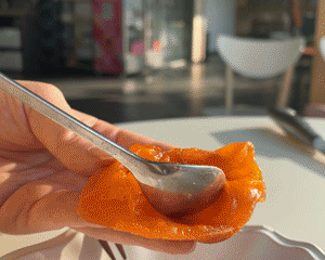 咬开外皮,明艳透亮的橙红色流心就急不可耐地涌了出来,浓缩了柿子的香甜软糯。