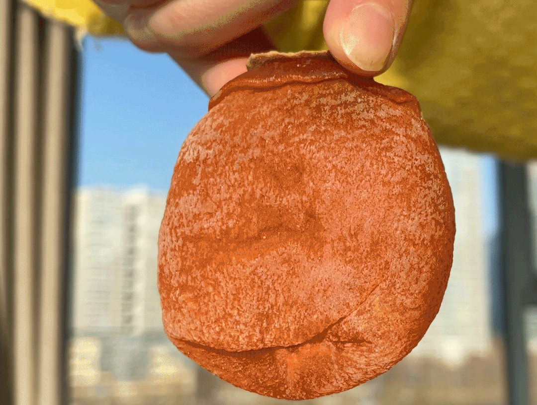 正因为临朐的柿饼并不追求厚厚的糖霜,所以它水分相对来说更充足些,黏软的果肉是真·流心状态。饱含柿子风味的湿润感在舌头上铺陈开来,就像在吮吸一颗柿子果冻。