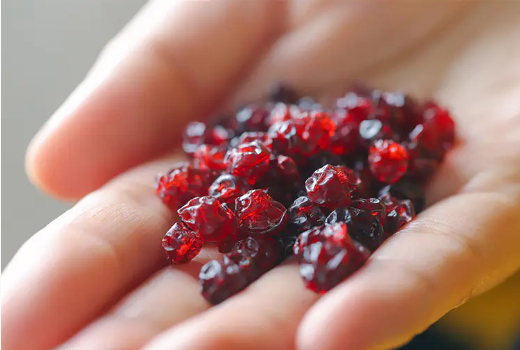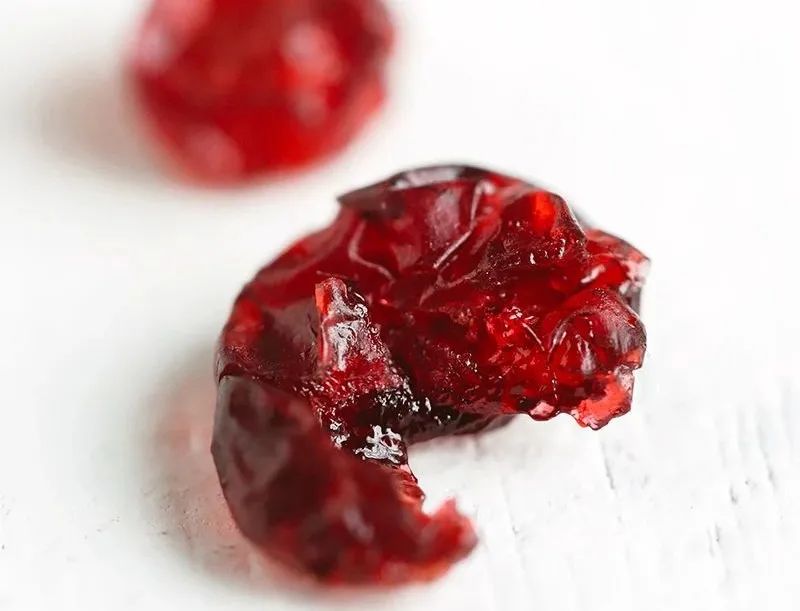 数据来源:DBS 23/008-2019《食品安全地方标注——越桔》 这样优质的野生蔓越莓,数量也极其稀有。丰收年景产量约1万吨,欠收年景产量只有一两千吨。产量本就少,制作成果干更是少之又少, 一斤鲜果也只能出100g果干! 野生的浆果果干是极小的,直径只有0.5cm。放进口中,先尝到一股子明快清爽的酸味,叫人一下口舌生津,肠胃中像是开辟出一条康庄大道来。而甜的味道,居中调和而不占主导,把自然的风味尽量呈现到最妙,一粒一粒嚼着吃,蔓越莓果干质地坚韧,肉质Q弹。后味虽有些微苦,可别轻易diss这苦味,这苦味可是植物防御病害、保护自己的一种‘天然武器’,所以这种小果子才能做到180项0农残检测啊!