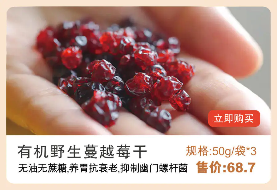我们拿它和种植蔓越莓干做过对比:野生蔓越莓抗氧化能力是种植蔓越莓的2.2倍,ORAC值是后者的2.3倍,原花青素含量更高达后者的21倍。同时,我们也做了180项农药残留检测,全都通过。不含农药残留,自然避免了现代农业中反营养物质的摄入。