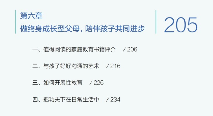 第六章则可以定义为父母成长:我们给爸爸妈妈们推荐了一些家庭教育书籍,介绍了和孩子好好沟通的艺术,如何开展性教育,如何在点滴生活中去积极引导孩子。