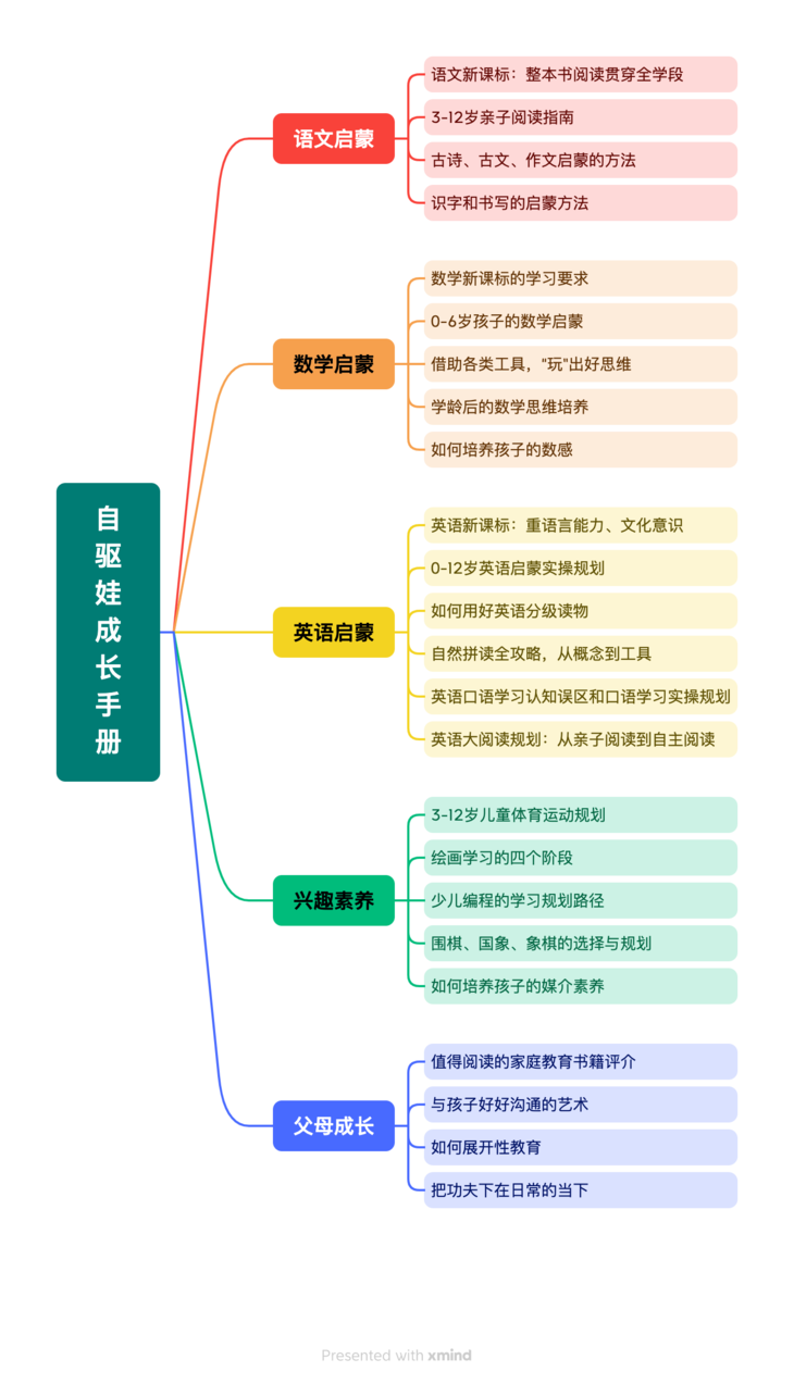 《自驱娃成长手册:父母全科规划指南》就为家长提供了完整的学习思路:从概念解释(理解为何)、评测(筛选)、如何使用……