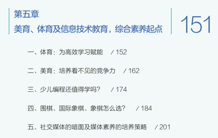 第五章则概述了美育、体育以及信息技术教育等在新时代教育体系中的重要性与作用,特别是在促进孩子综合素养发展方面所起的重要作用。