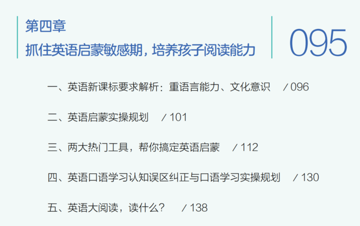 不仅如此,英语启蒙的常见“误区”也有单独的章节进行阐述,如要不要给孩子翻译,要不要纠正孩子发音,阅读要不要指读,这些问题都给了具体的建议。让家长明白应该怎么做,还能避免“踩坑”。