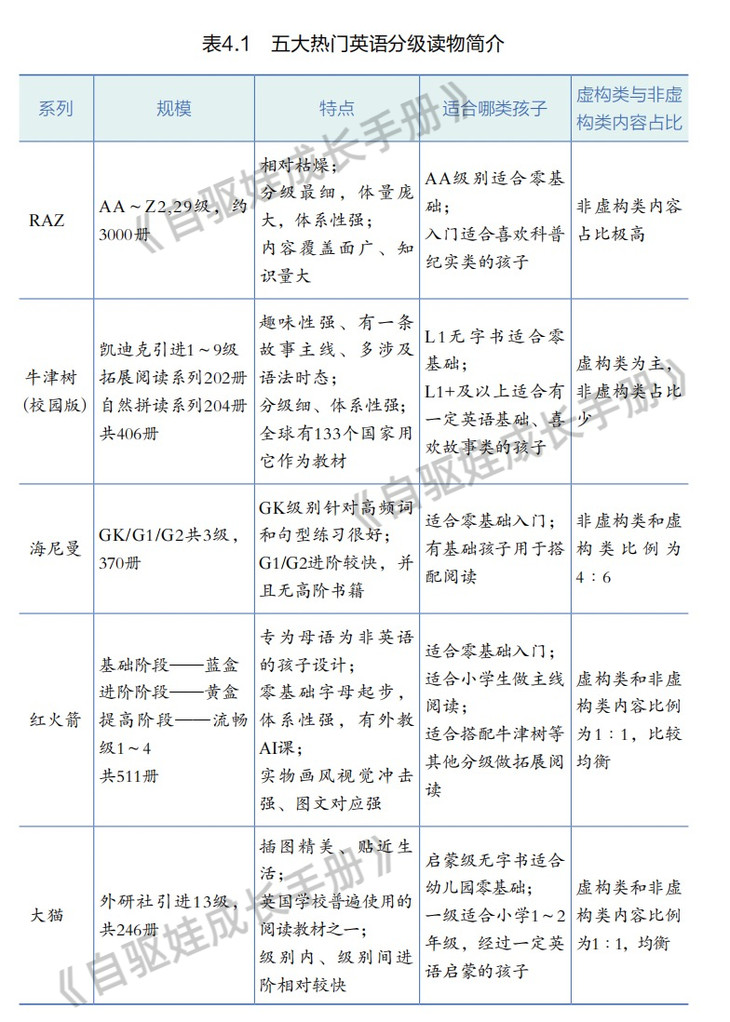 上面的规划路线中,有两个工具是特别重要的,就是分级阅读和自然拼读。书中也有单独的主题对这两个热门工具展开具体的介绍: