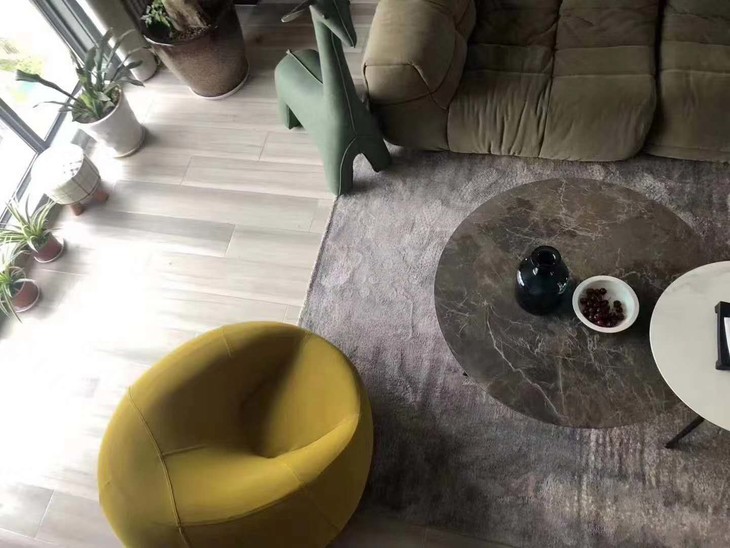 大理石茶几质感纹理,简洁而精致。沙发边,获得红星奖的黄色柿子椅打破了中性色彩的静寂,深浅交织带来舒适平和的自然感官,更添一份优雅舒适