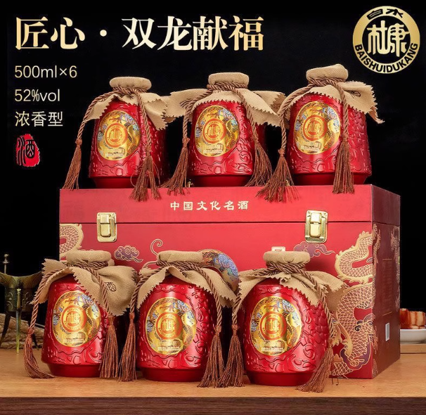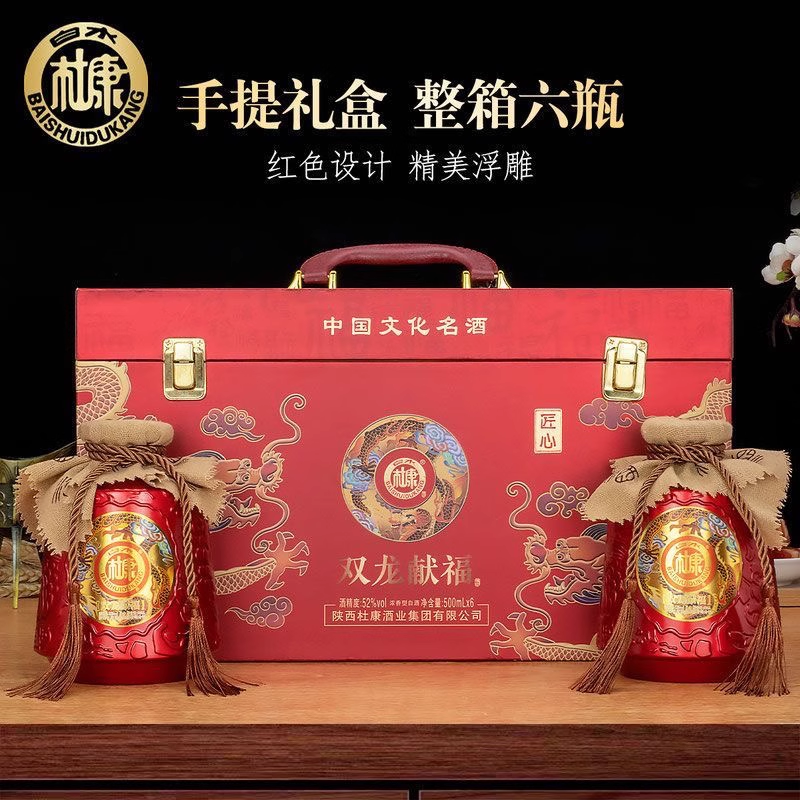 包装太喜庆了!红色礼盒搭配金色双龙图腾 + 精美浮雕,金红配色大气又吉祥,"双龙献福" 寓意富贵吉祥、福气满满。整箱 6 瓶 500ml,手提设计方便拎着走,不管是走亲访友送礼、家庭团圆摆家宴,还是日常自饮、朋友小聚,拿出来都倍儿有面,不用额外包装就很得体。