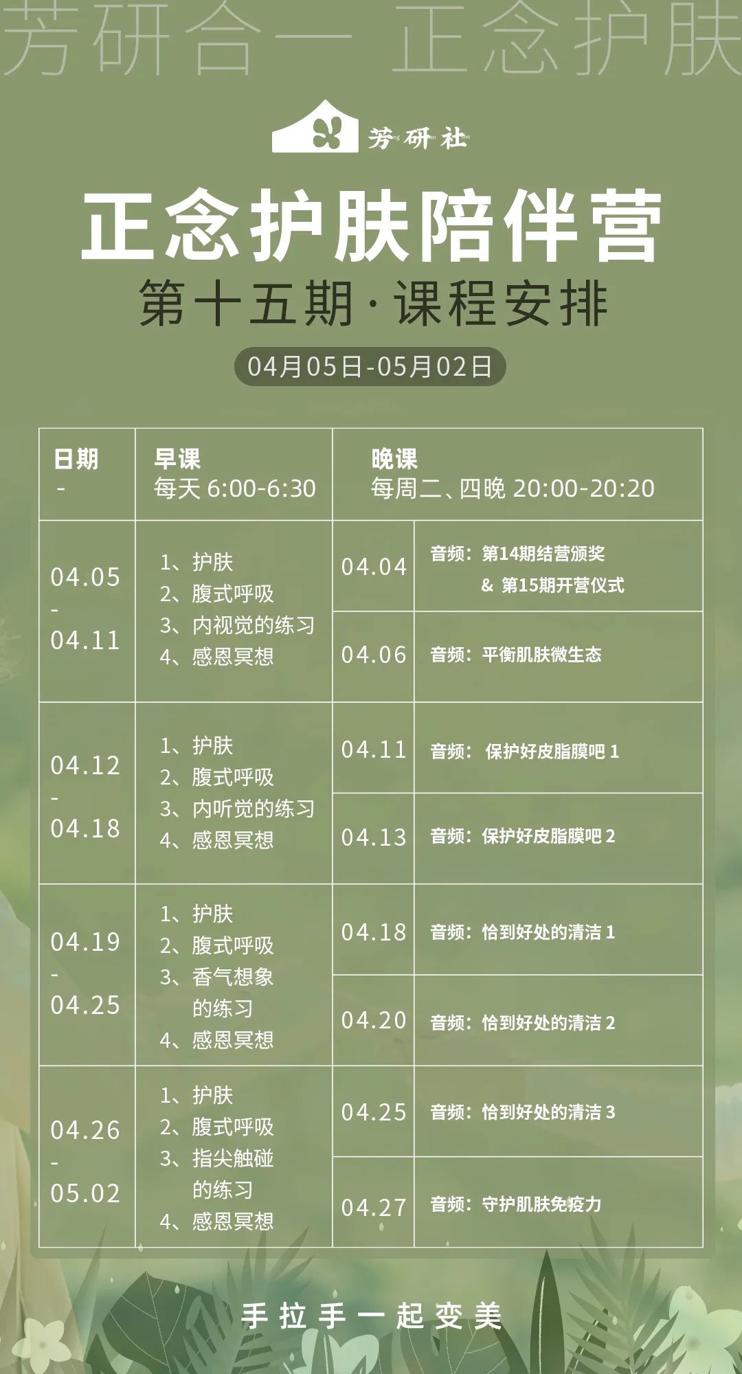 好了,以上是第15期的课程安排,晚课主要是肌肤的四大屏障,早课是把我们的感觉练习得更加的精微,到这里就介绍完了,还是对大家有一个小小的建议,就坚持打卡,打卡真的是一个快速提升的好方法。