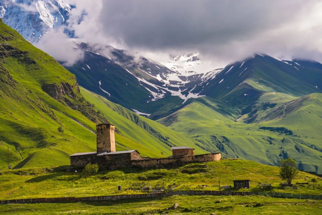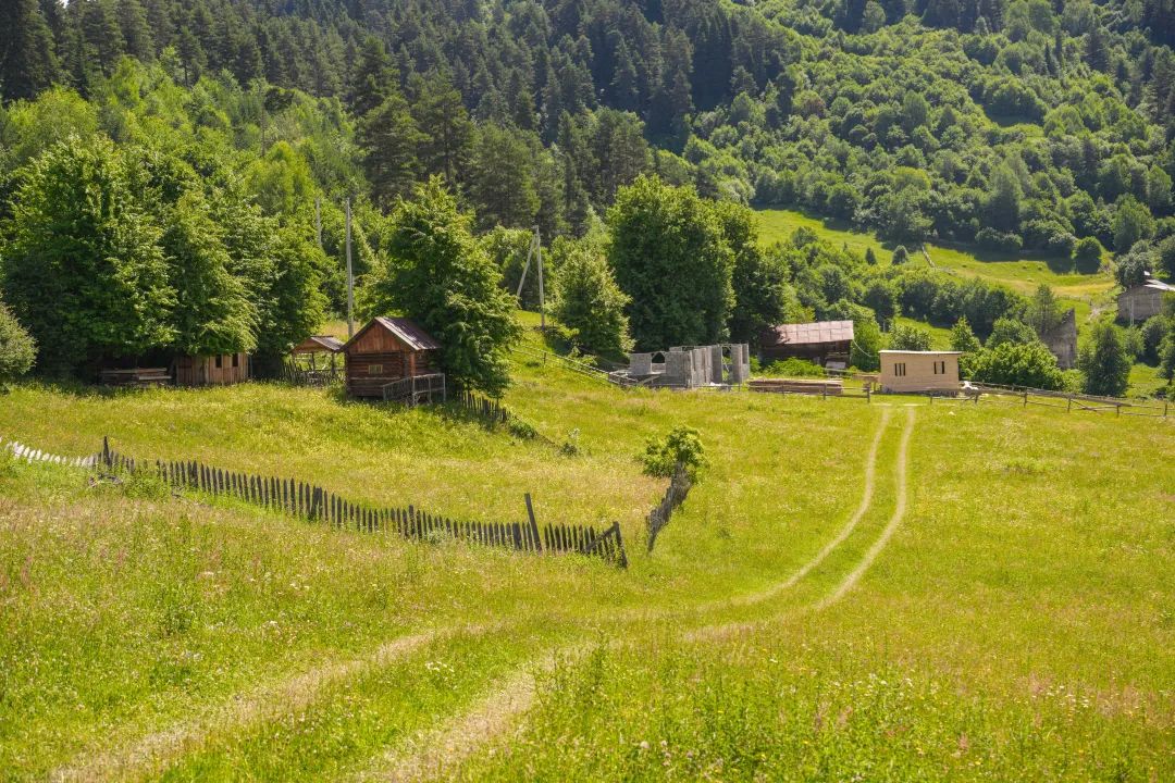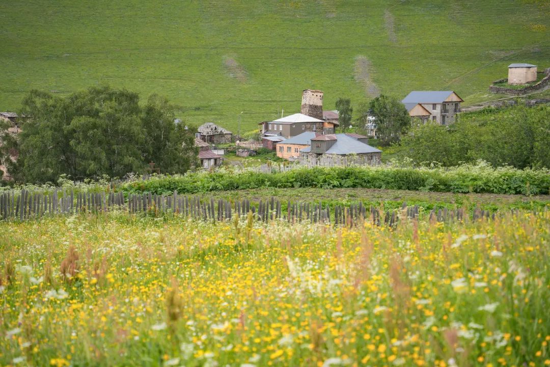 我是在2024年6月第一次与格鲁吉亚会面,那是大高加索以南山景最美的季节之一,所有的山坡和低丘处的森林草甸,被一片深浅不同的翠绿、蓊绿、苍绿覆盖,毛茛、蒲公英、野豌豆花轰轰烈烈是漫山遍野最亮丽的颜色,浅蓝色的阿拉伯婆婆纳像发光的星星点缀其间,村庄与远方皑皑雪山呼应。傍晚时,夕阳的最后一缕余光从村子中间的教堂顶端扫过,扫过踢球的小孩、摆荡的秋千、窗台前刚插上的野花束,刚出炉的烤面包也香了起来,晚餐用罢推开门,仍可仰望天空、远山和星辰。