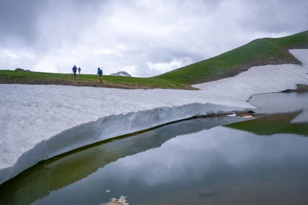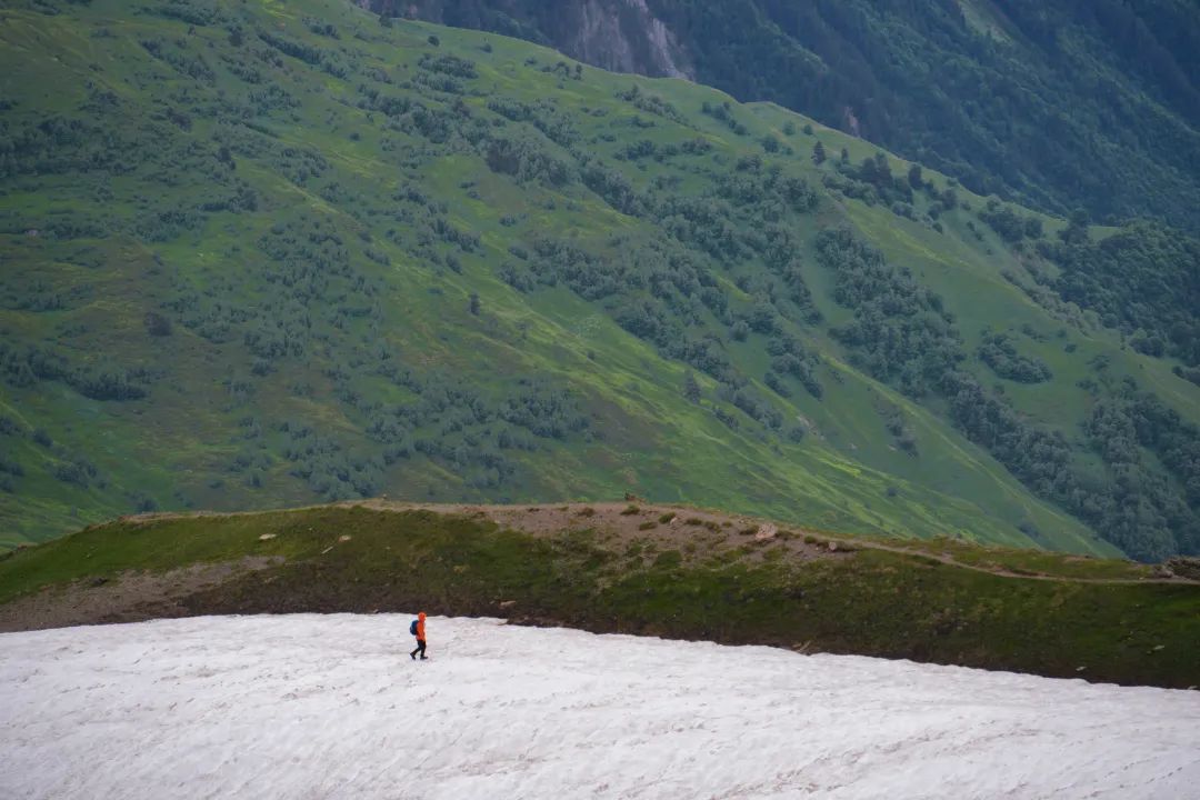 图@子君-Koruldi湖&ushba雪山冰川阴雨天为Koruldi湖蒙上一层阴郁神秘的色彩,遗憾的是雪山和冰川都无缘得见。但是你能想象吗?这段单程约5KM、最高点海拔没超过3000米、白日均温15度以上的徒步线上,可以神奇地看到布满鲜花的草场、冰湖、碎石垭口和森林同框的画面!