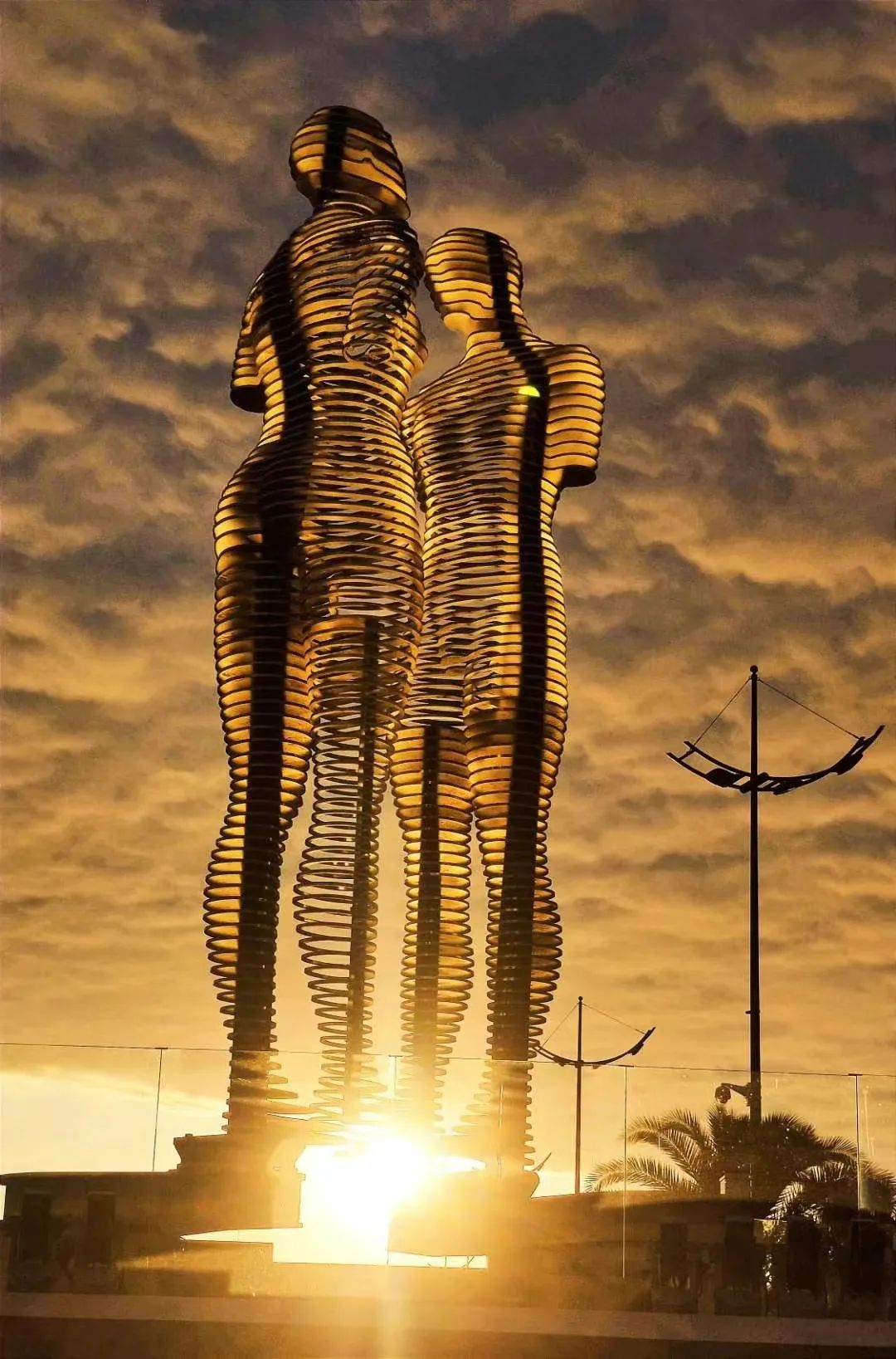 图@子君-黑海之滨巴统Ali & Nino 移动雕塑@拍摄:牧歌雕塑艺术家Tamara Kvesitadze根据小说《Ali and Nino》创作了这组雕塑,它一度成为了这个城市的象征。小说讲述了:Ali是一位信奉伊斯兰教的阿塞拜疆青年,Nino则是一位信奉基督教的格鲁吉亚公主,两人因为同在一所学校相知相识相爱,当终于以为排除万难走到一起时,却因为东西方文明、宗教信仰等的分歧与冲突,以悲剧告终。雕塑的表现形式比小说更生动:白天Ali和Nino沉默站立望向着彼此,夜幕降临时他们开始缓慢向对方移动,穿过彼此的身体后渐行渐远,周而复始地相遇-拥抱-再见,仿佛面对命运捉弄的无可奈何。