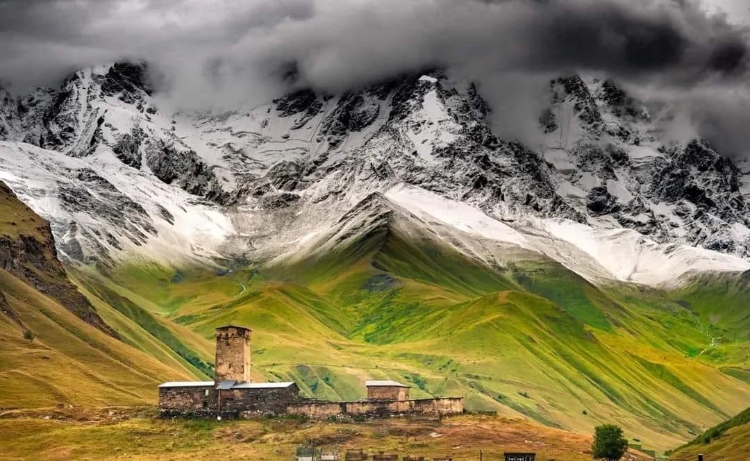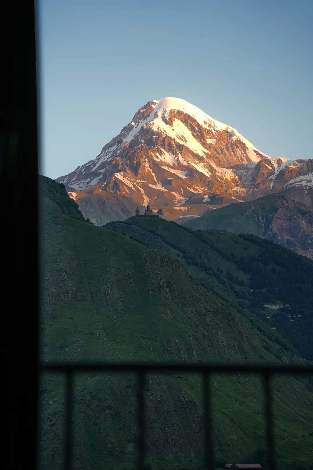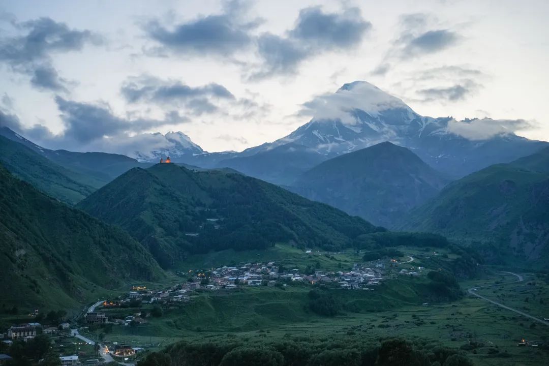 图:@子君-卡兹别克,高加索山脉第五高峰,形似蜀山之王贡嘎我们住在山下河谷的特潘茨明达小镇上,傍晚远眺Gergeti Trinity Church圣三一教堂(据说是欧洲海拔最高的教堂),背靠巍峨雪山逐渐亮起明灯;清晨推窗,金山耀眼夺目!