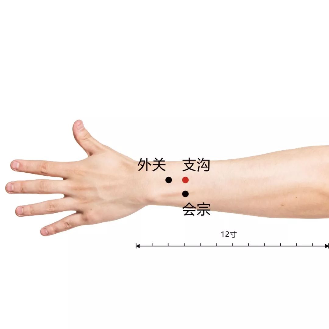 支沟:位于前臂背侧,当阳池与肘尖的连线上,腕背横纹上3寸,尺骨与桡骨之间。