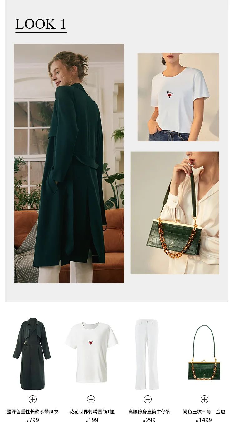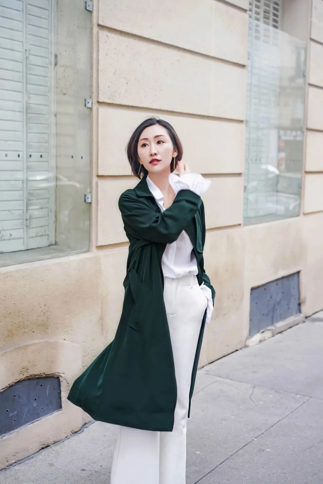 第一套初秋的Look,配色是很显贵的墨绿加白色,