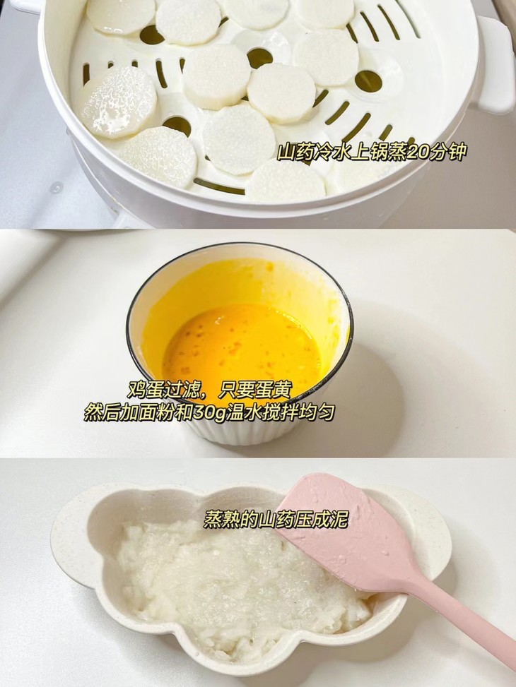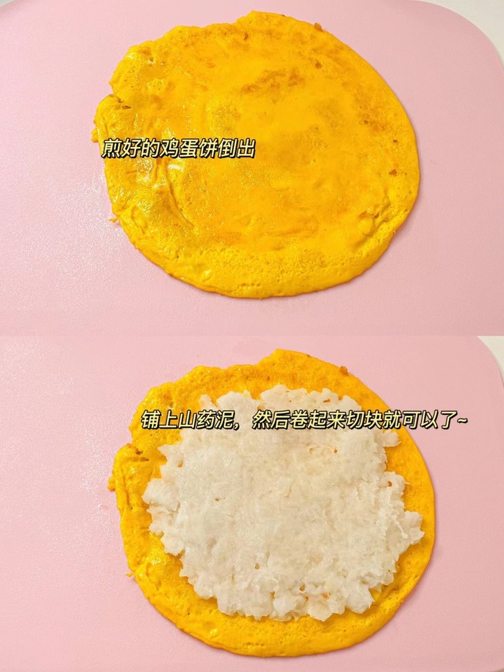 蒸熟的山药压成泥,不粘锅刷油,油热倒入鸡蛋煎熟盛出,然后铺上山药 卷起切块就可以了👌🏻