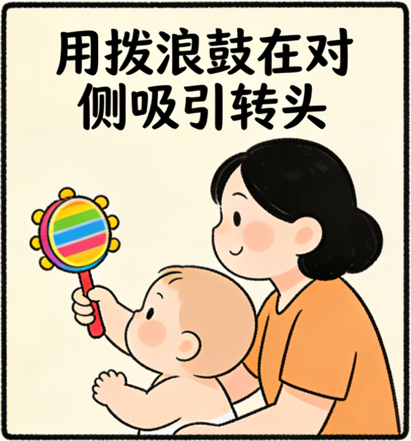 1.喂奶/喂食时:从宝宝不喜欢转头的那一侧进行,鼓励他主动转向该侧。