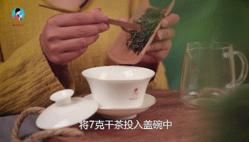 将7克《弯弓》从茶荷中倒入白瓷盖碗,注入92℃水温,即入即出,润茶2次。