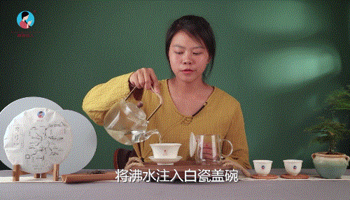 将沸水注入白瓷盖碗、公道杯、品茗杯中润洗1次。