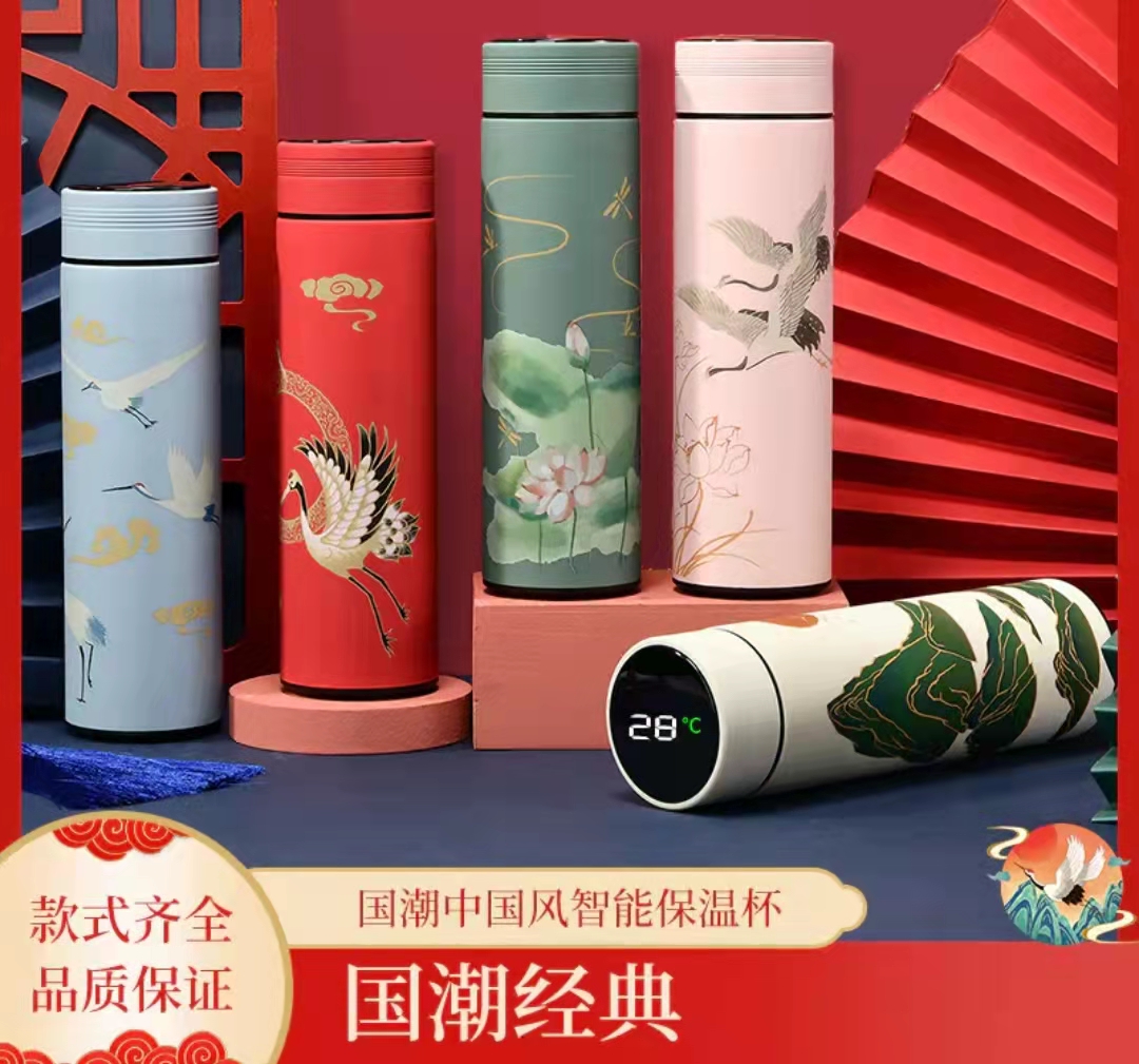 国潮保温杯,智能显温,304优质食品不锈钢内胆材质、杯身轻巧、真空隔热层,密封杯盖防漏水。