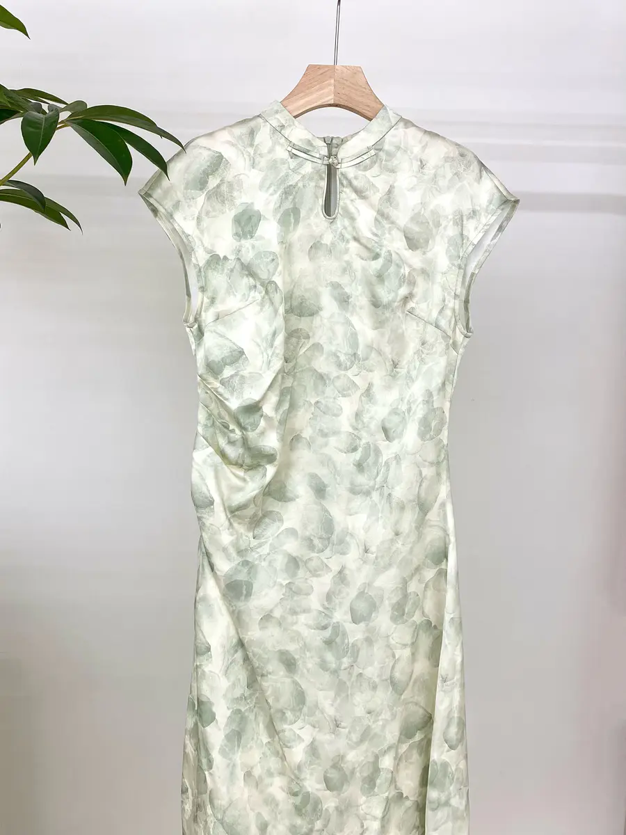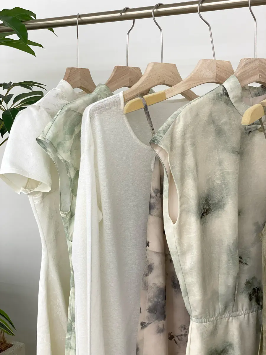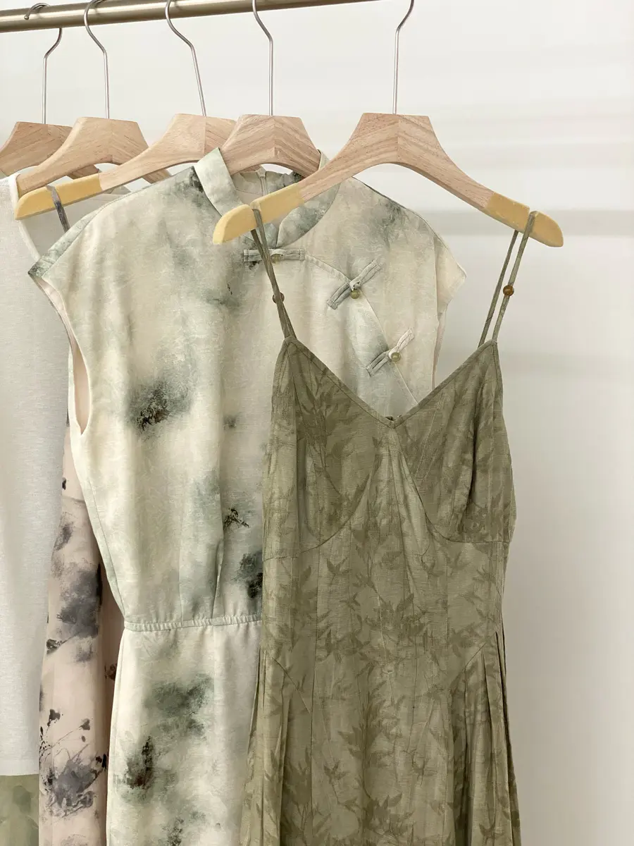 本期新中式主要以黄绿色调为主,结合晕染色调带来一种轻柔的江南风景,并且采用了一些传统的旗袍设计元素,更加复古气质;