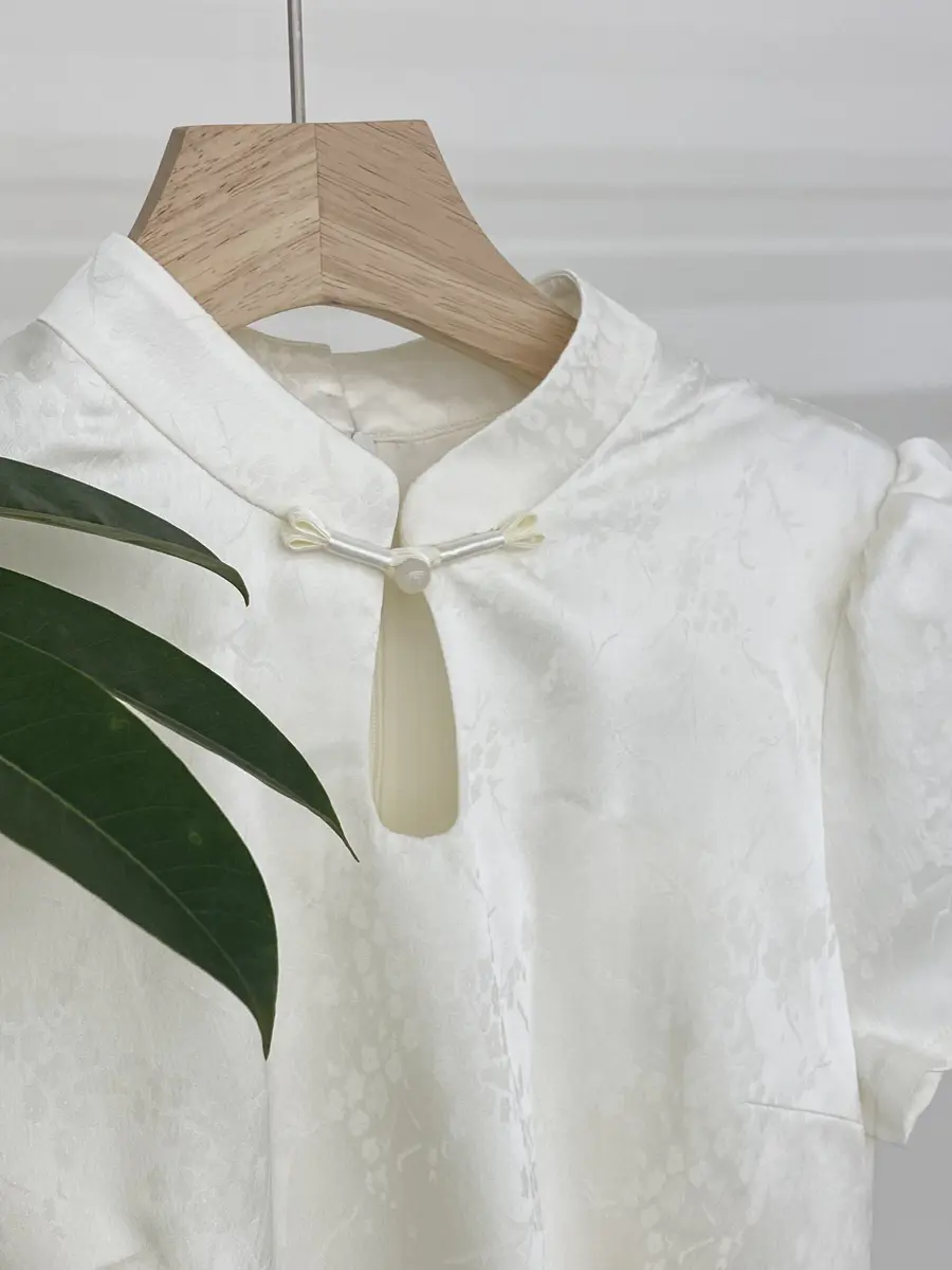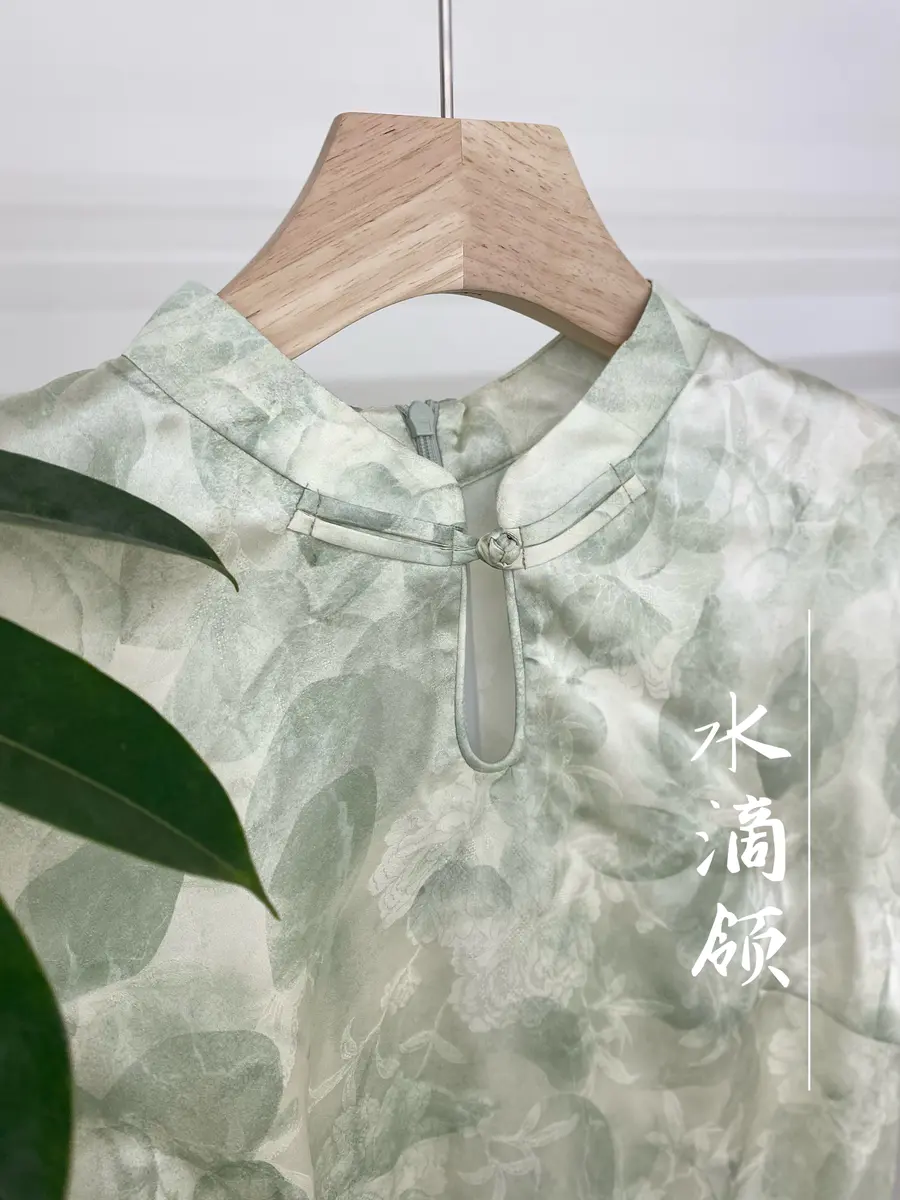 比较特别的是领口不对称挖空设计,会增加点点小性感,点缀小珠子更增添中式韵味;