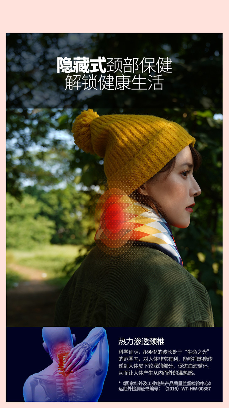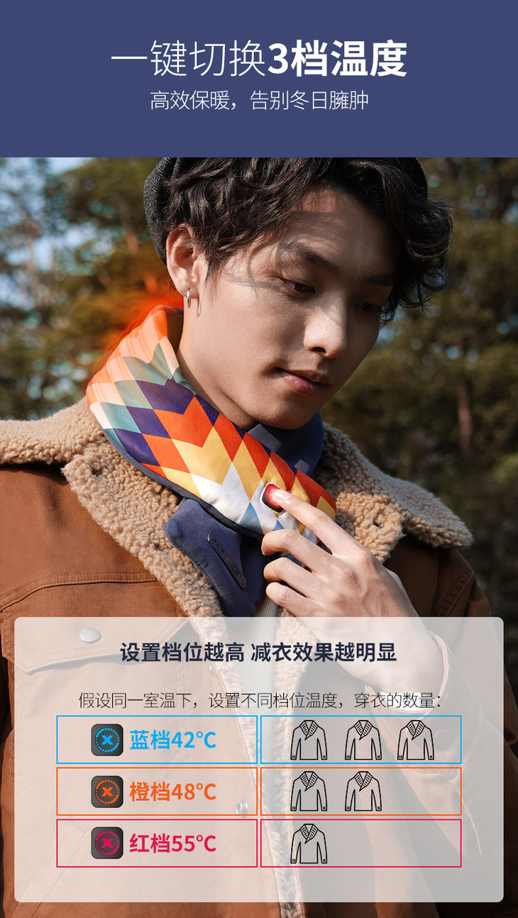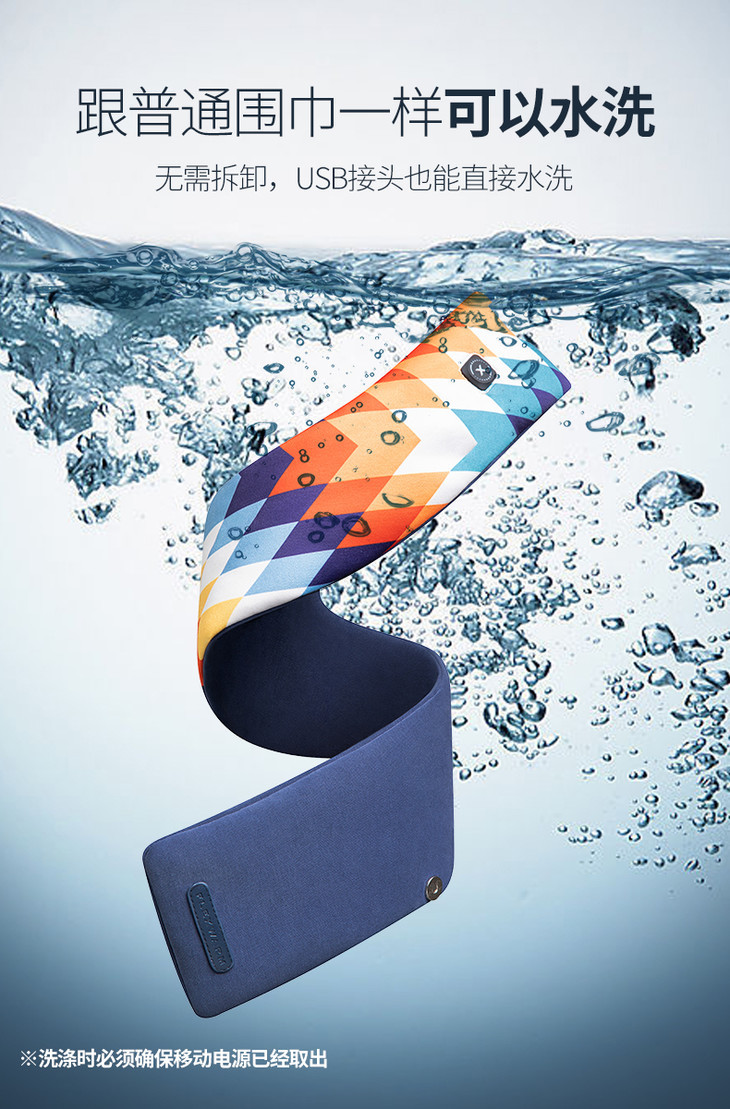 轻松穿戴 美观易用 一体式设计 ,跟普通围巾一样可以水洗 ,无需拆卸,USB接头也能直接水洗