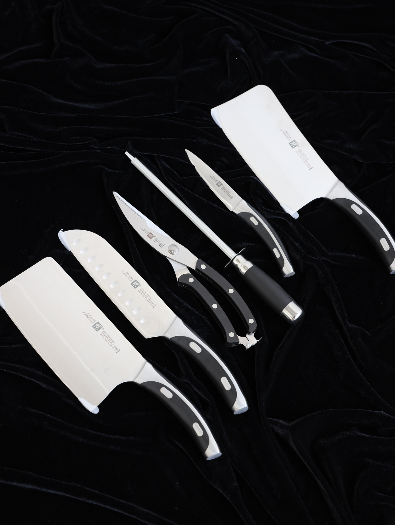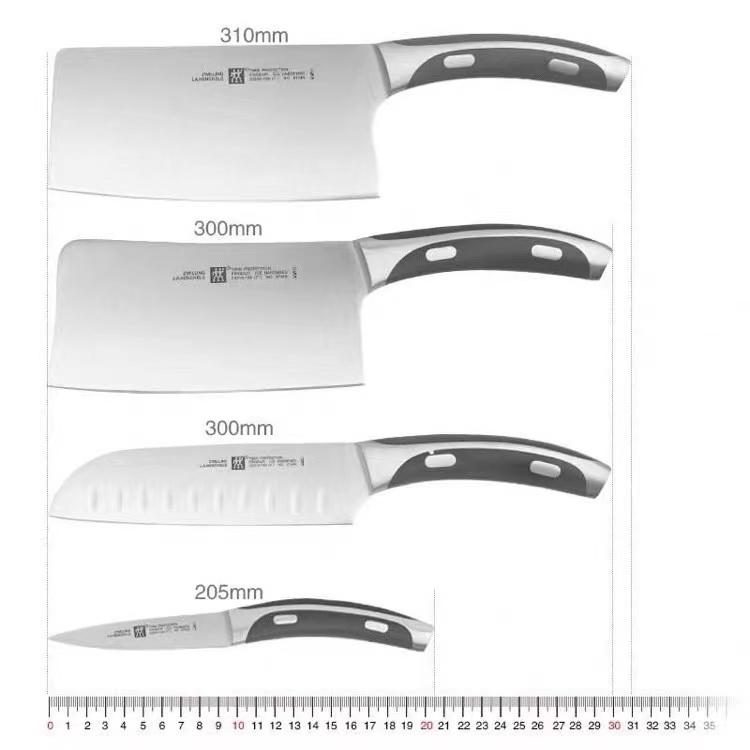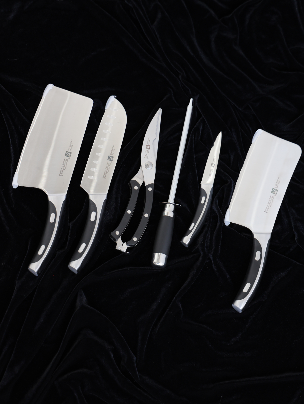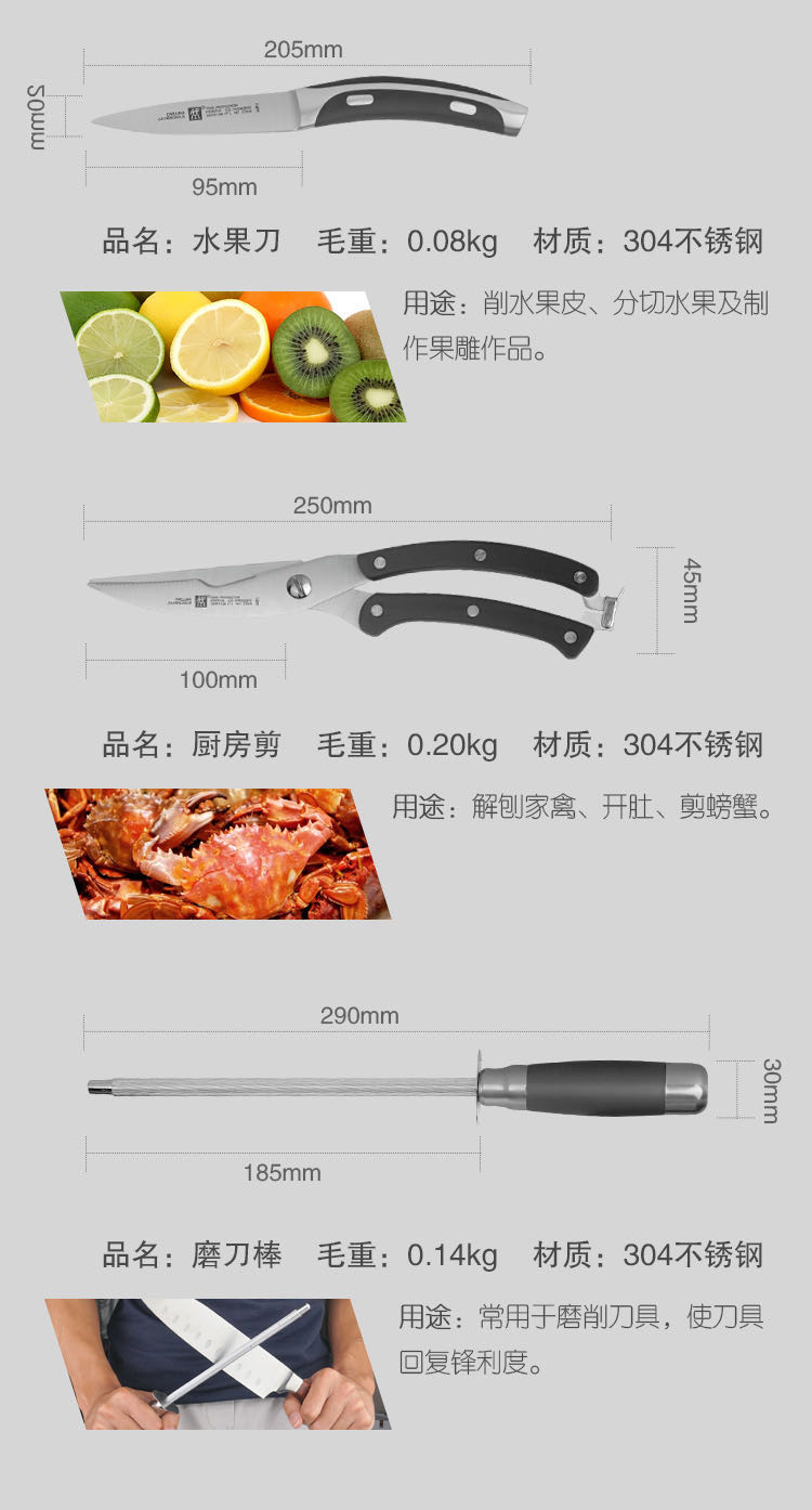 菜刀1把,砍骨刀1把,水果刀1把,多用刀1把,多用鸡骨剪1把,磨刀棒1个,不锈钢刀座1个,7件组合