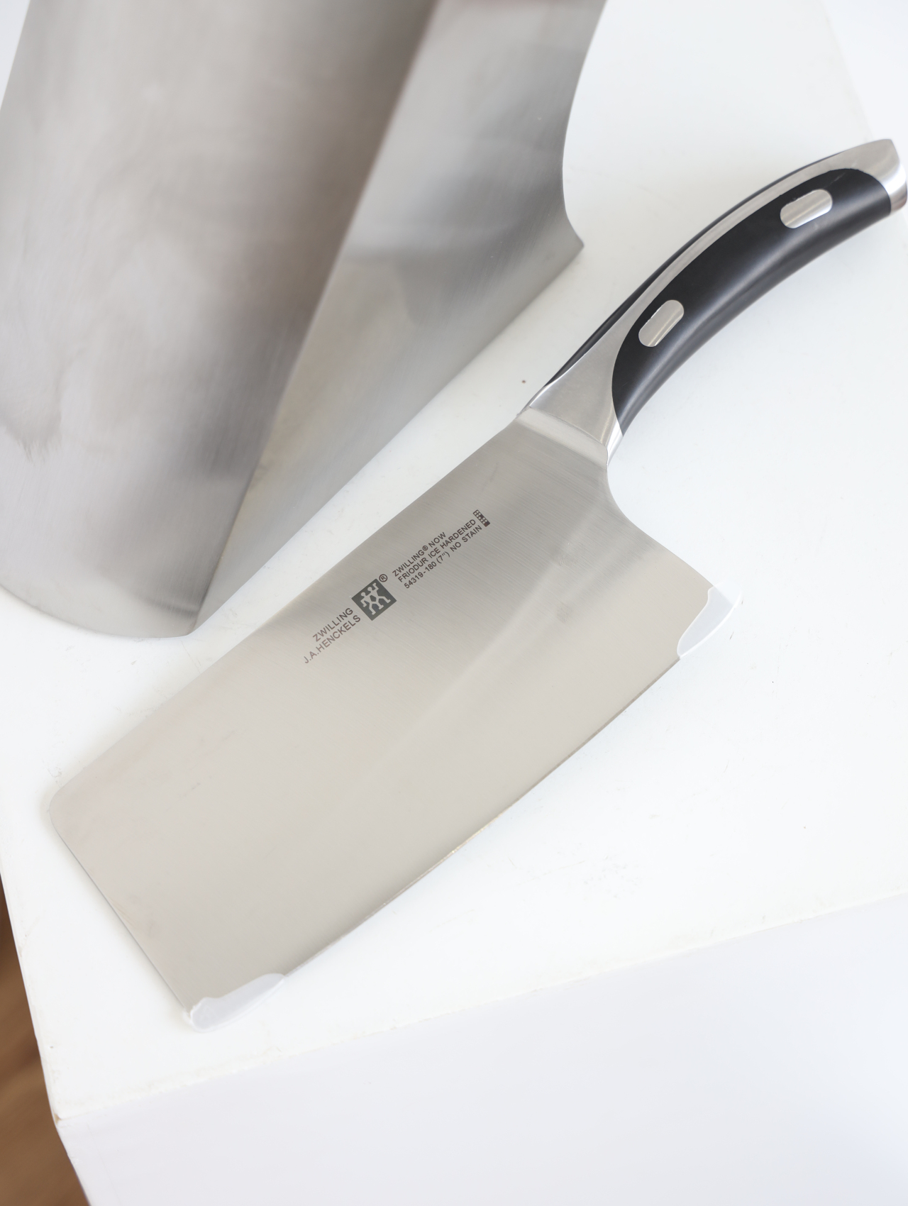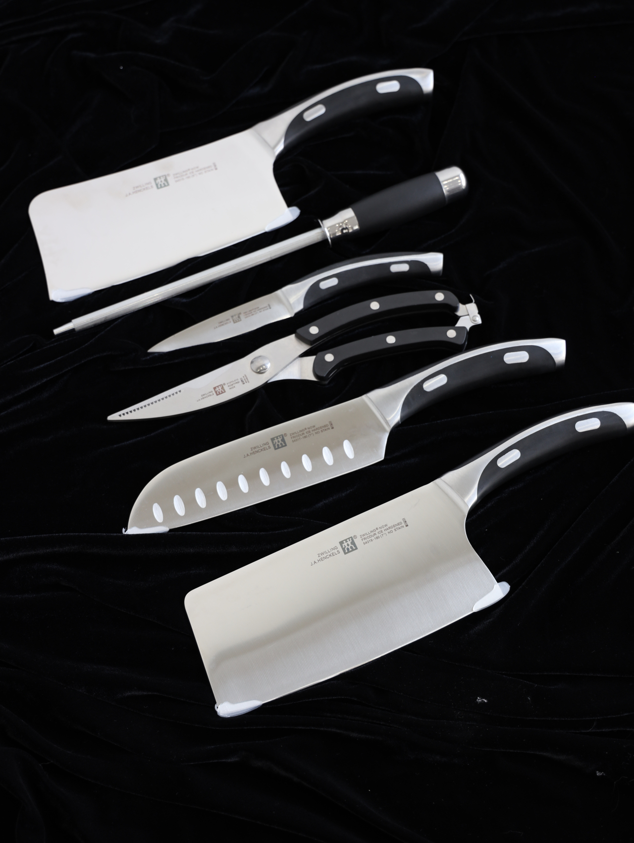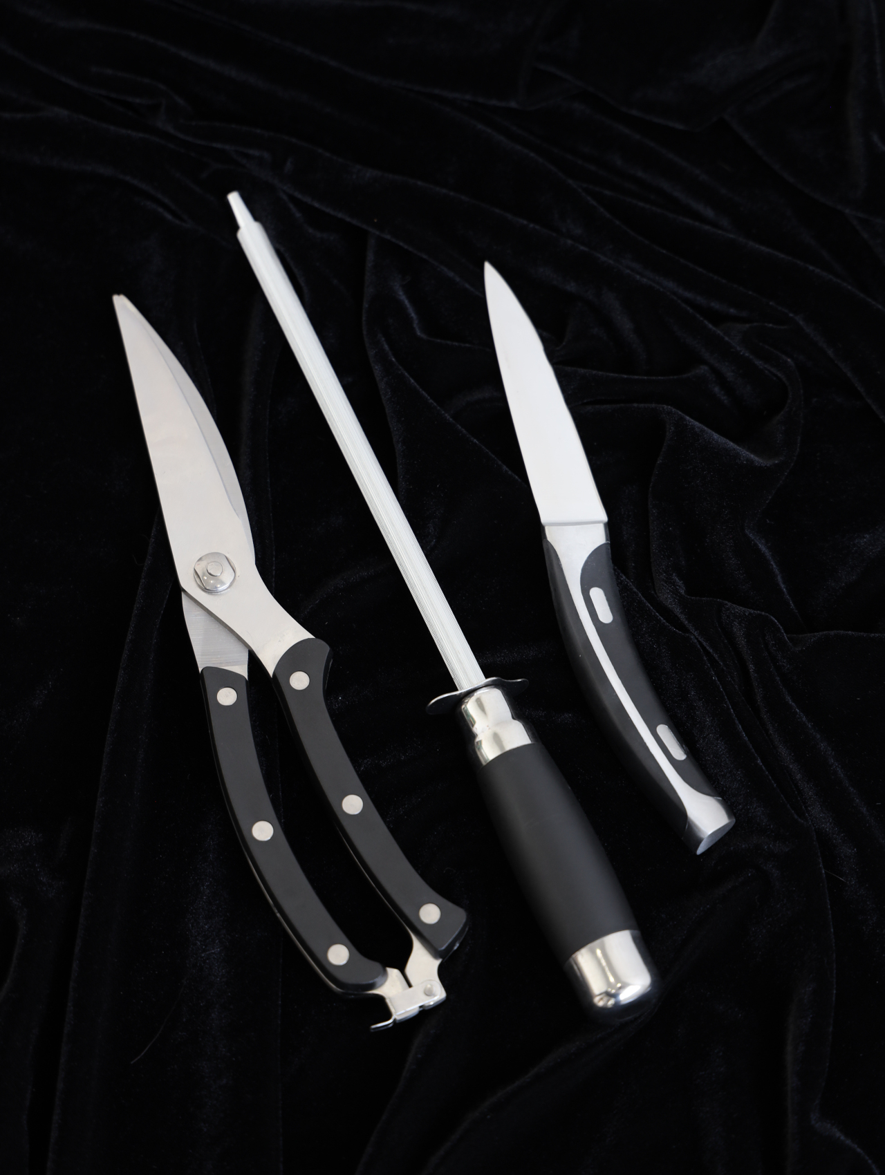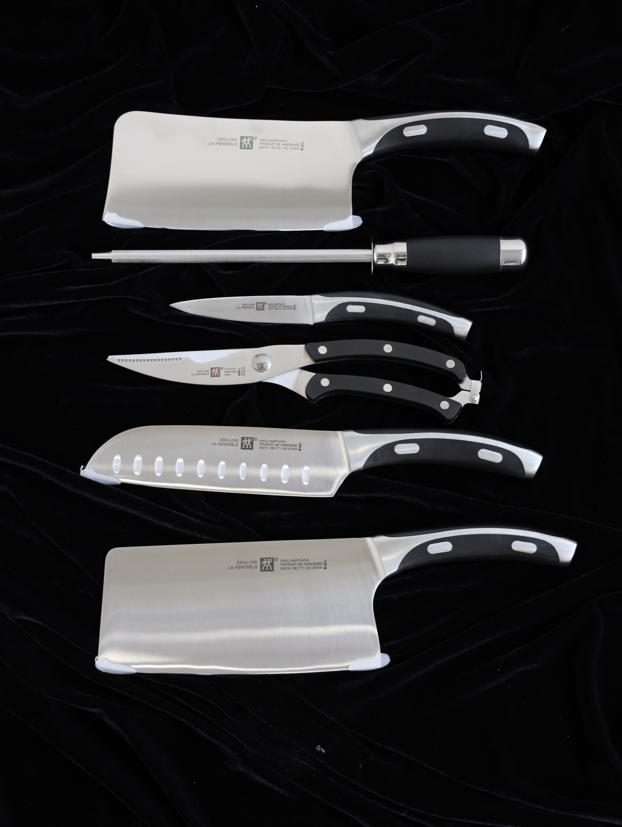 菜刀1把,砍骨刀1把,水果刀1把,多用刀1把,多用鸡骨剪1把,磨刀棒1个,不锈钢刀座1个,7件组合