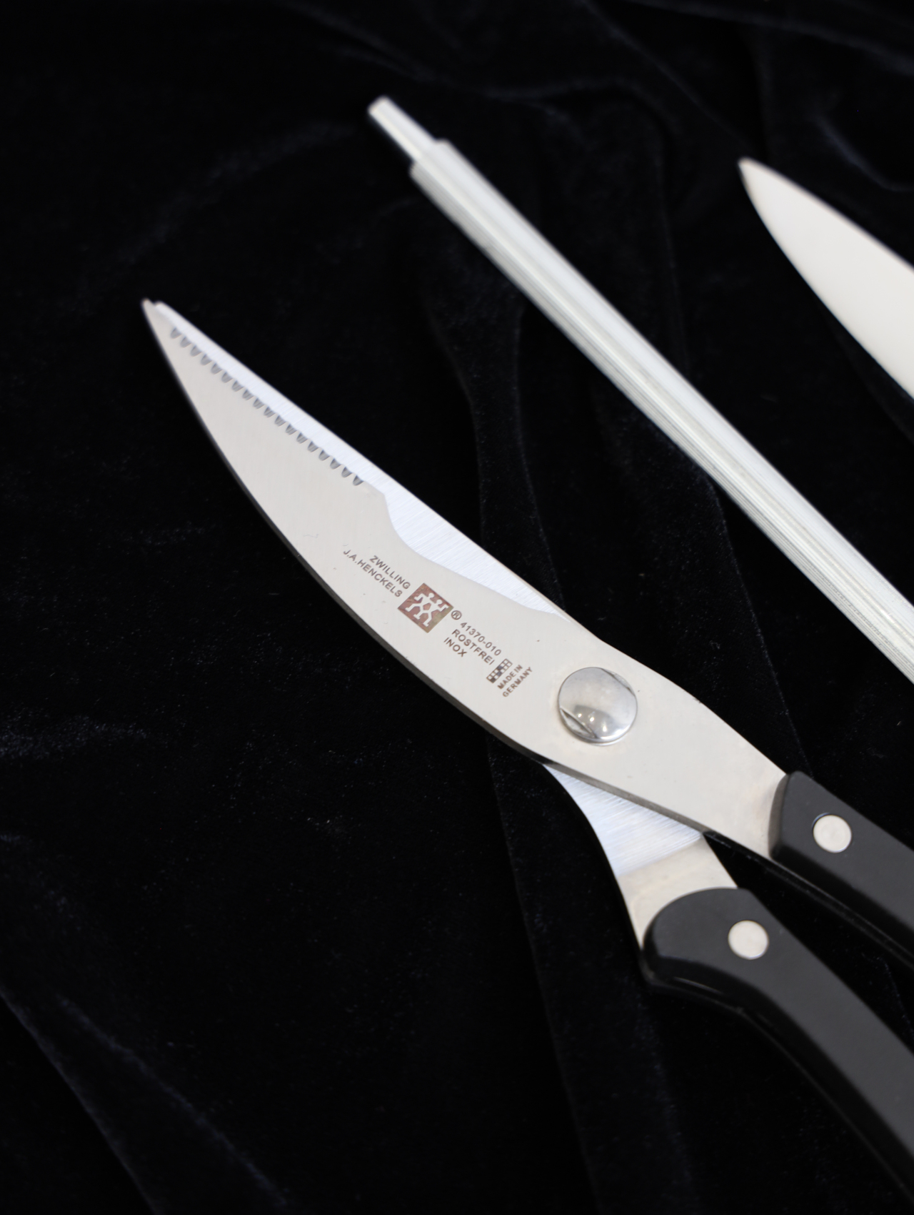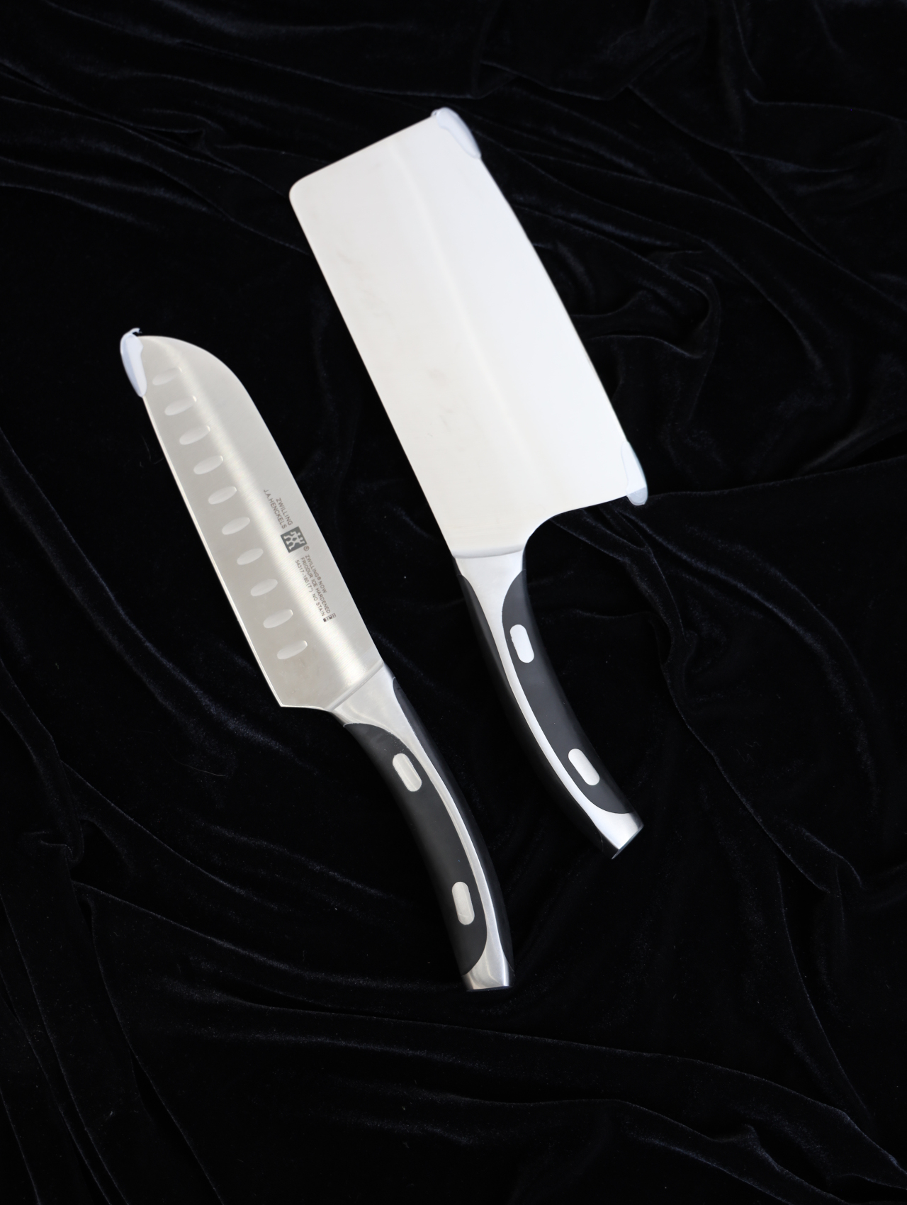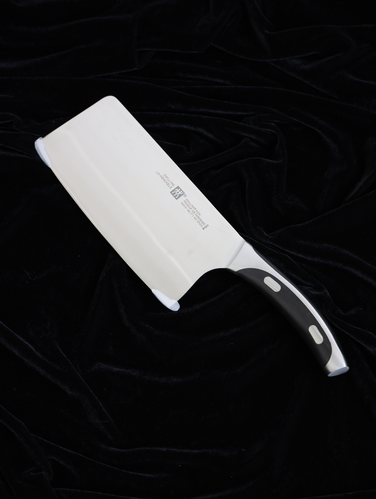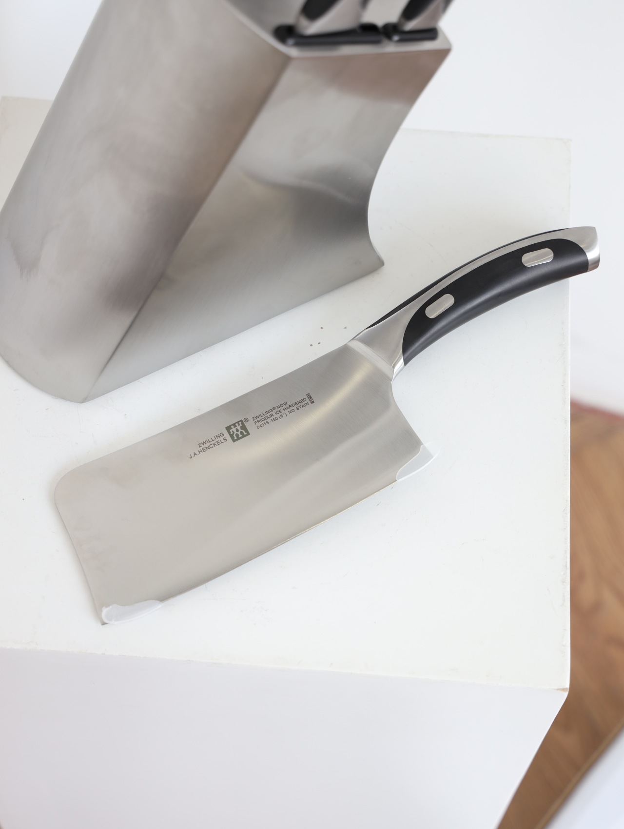 菜刀1把,砍骨刀1把,水果刀1把,多用刀1把,多用鸡骨剪1把,磨刀棒1个,不锈钢刀座1个,7件组合