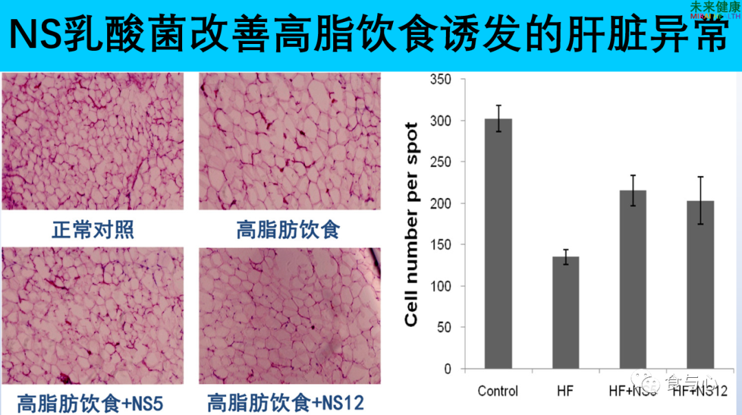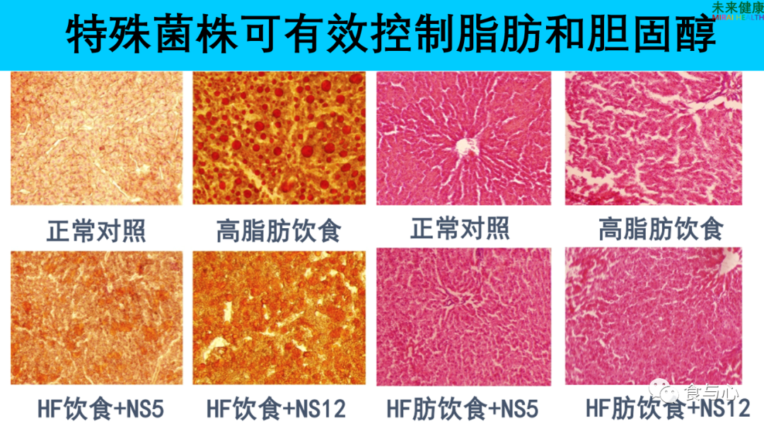 这两项研究与食与心研究组的研究一致,我们实验室的研究也证明:高胆固醇饮食的大鼠补充NS5和NS12乳酸杆菌,不仅能调整肠道菌群,降低血液总胆固醇水平、低密度胆固醇水平、甘油三酯水平和载脂蛋白含量,还能调整胆固醇代谢相关基因表达,减轻肝损伤,减小肝脏脂肪细胞体积,减少肝脏脂肪沉积