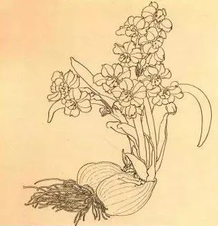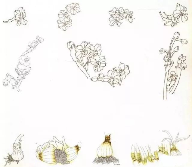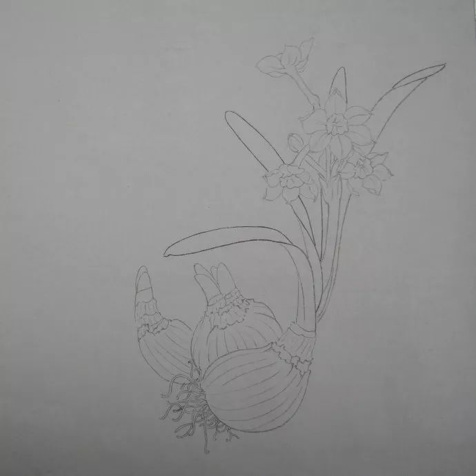 步骤一:先用白描勾勒出水仙花,注意起收笔的细粗变化,花头的疏密变化,花根用枯笔勾勒表现力度。