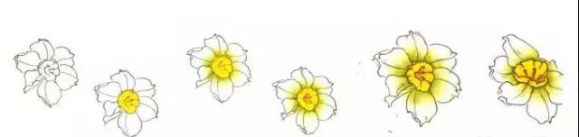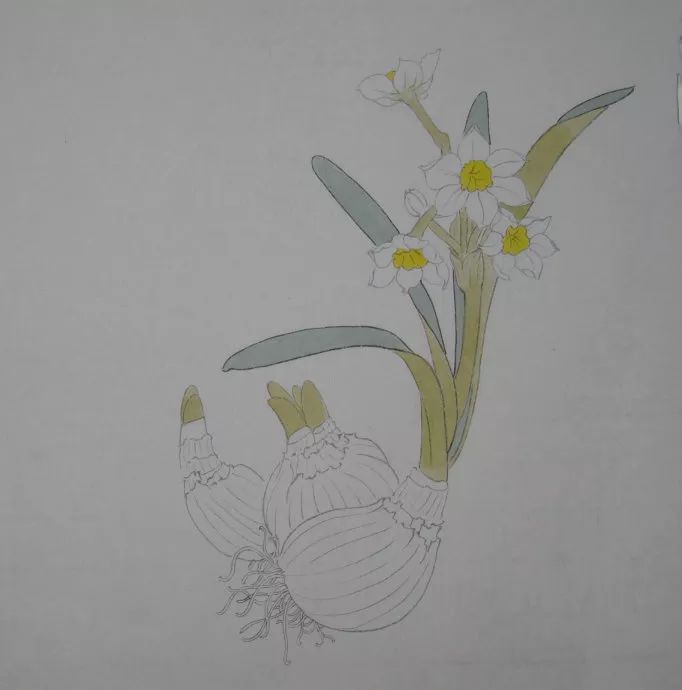 勾线填色法:先用淡墨勾花瓣和副冠,然后设色。用白粉从瓣尖向内分染两遍,用藤黄平涂副冠,用三绿加藤黄,从内向外分染两遍,再用藤黄调花青和墨分出花瓣的结构。副冠用朱磦调墨分出它的结构变化。