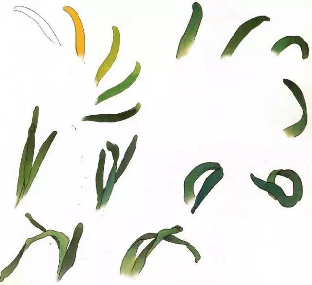 用淡墨勾出叶子的形状。先用白粉从叶子的顶端向下分染一遍,平涂一遍藤黄,罩染一遍三绿,再罩染一遍三青,最后用花青调墨分染一遍,再复勾一遍线条即可。