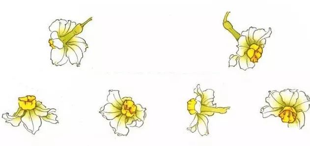 水仙花与单瓣和复瓣之分。单瓣花瓣6裂,展开似台状,副冠黄色呈现盏状,所以以“金盏银台”之称。复瓣花瓣12裂,花瓣基部联合成筒状,花朵玲珑小巧,所以有“玉玲珑”之称。