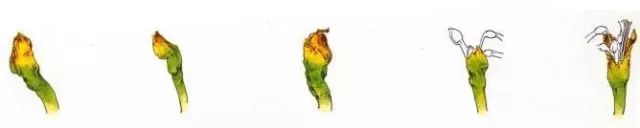 4.苞腹填色法:先用藤黄平涂一遍,再用三绿调少许藤黄从花梗向苞膜顶部分染。而后用藤黄调花青和墨依此方向分染一遍,最后用花青调墨分出苞膜的结构变化。