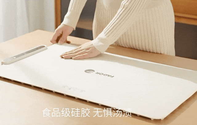 和市面上常见的玻璃、陶瓷、金属面板的刚硬冰冷感不同,这款暖菜板用的是软软弹弹的一体成型硅胶材质,每次使用跟铺桌布一样又快又爽。