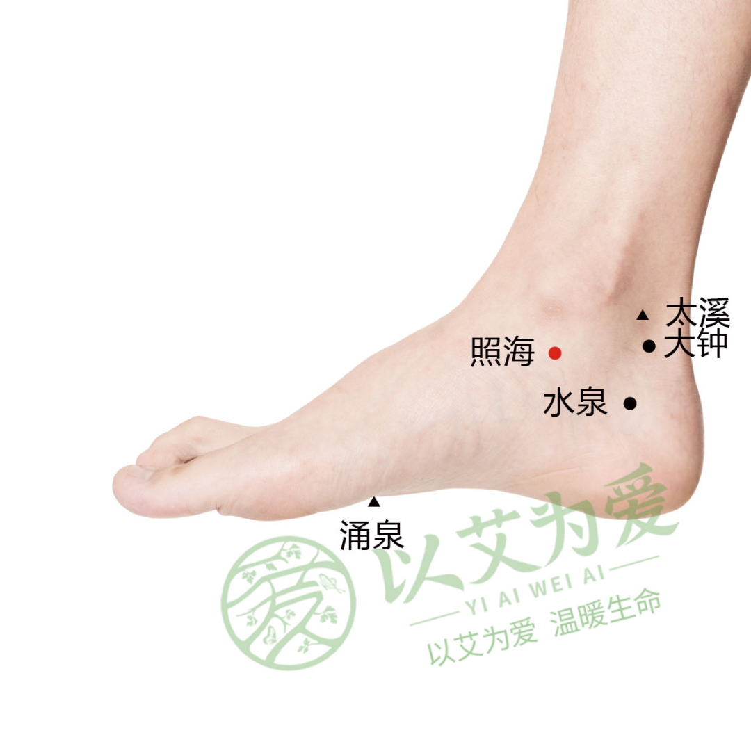 照海属足少阴肾经,是八脉要穴之一,通阴跷脉,有滋肾清热、通调三焦之功。 点揉此穴既可调理阴跷脉,又可以调理肾经,可谓一举两得的妙法。 按压此穴,能缓解胸闷、嗓子干痛、目赤、声音嘶哑、慢性咽炎等由于阴虚火旺引起的症状。 对肩周炎、失眠有辅助作用。