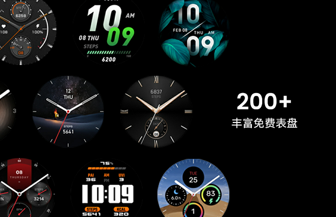 1.表盘爱好者的大满足,200+免费表盘,囊括模块化表盘、动态表盘、自定义表盘等众多选择。此次新增的模块化表盘不仅有丰富应用和数据组件,表盘背景更可跟随清晨、日间、日落、夜晚来变化。