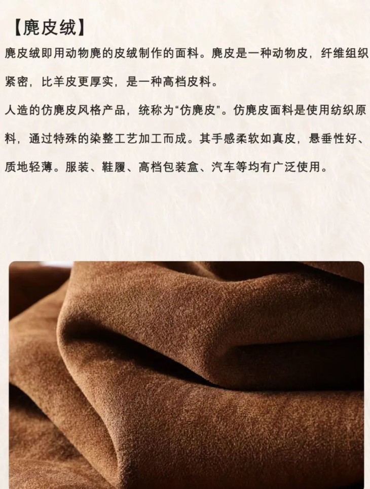 经过特殊的后整理后,细密平整,柔软丰满,比天然的麂皮更耐用,也更易保养。