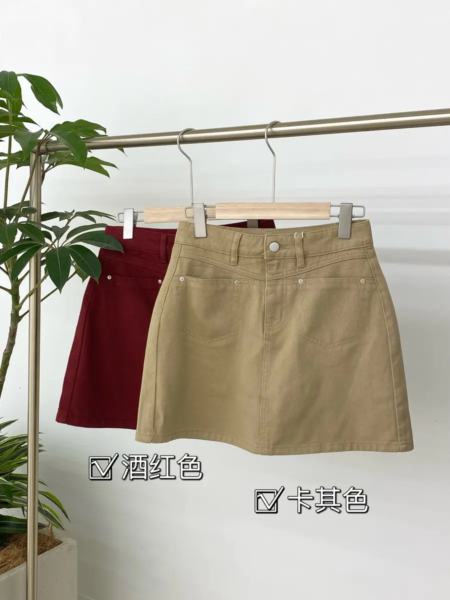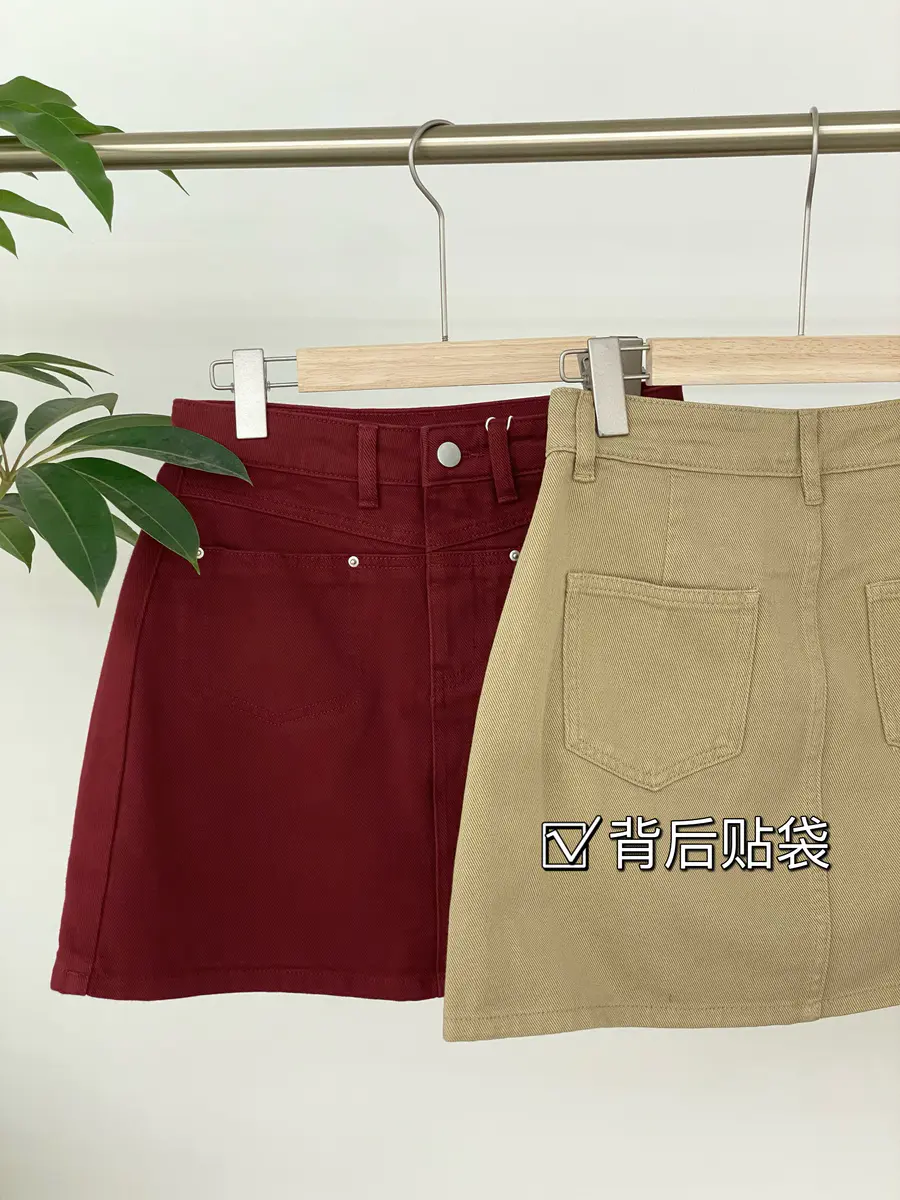 100%纯棉的一条牛仔半裙,总共给大家出了两个颜色,个性酒红色与百搭卡其色;