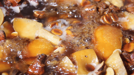之后进行古法熬制,何老二梨膏糖采用了原始的柴火慢熬,低温熬制所有食材,最大程度保留了食材的营养。