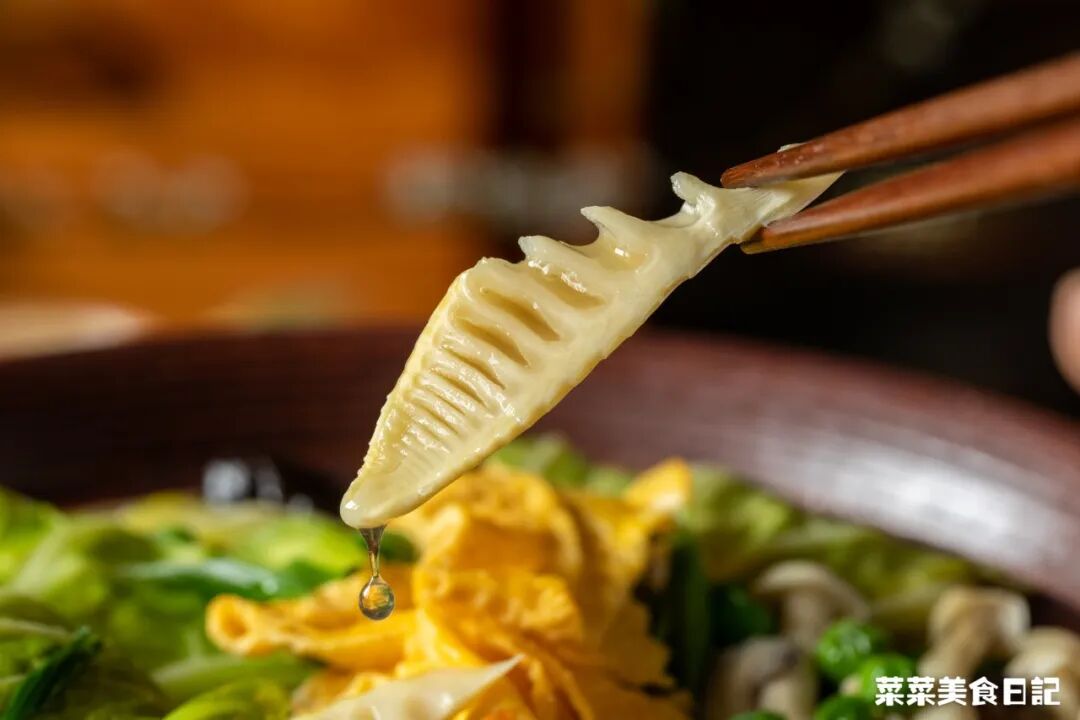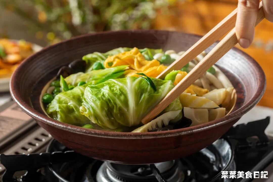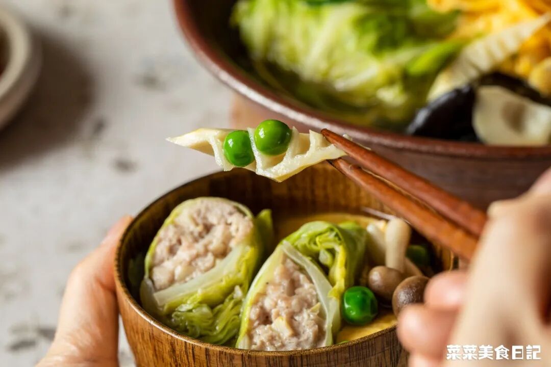 她将高丽菜叶拆下来,逐片提着,菜帮子先入水烫软,整片菜叶才滑入锅,数秒即起,菜叶软得足以包馅,但仍甜脆。