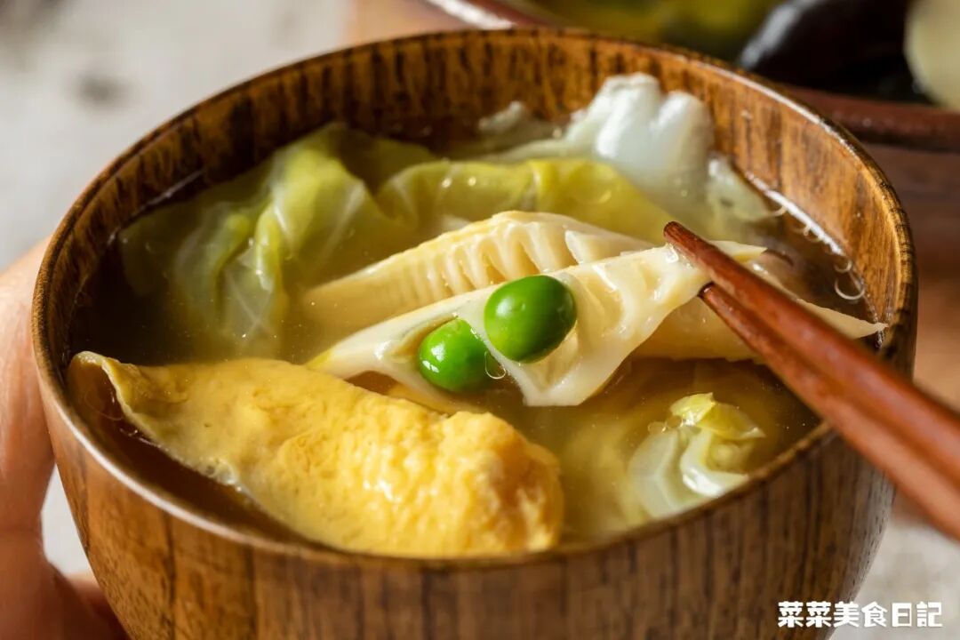 汤底: 一汁成鲜1/2条 菌菇100g 木耳50g 蛋丝100g 春笋1根 甜豌豆30g 青蒜10g