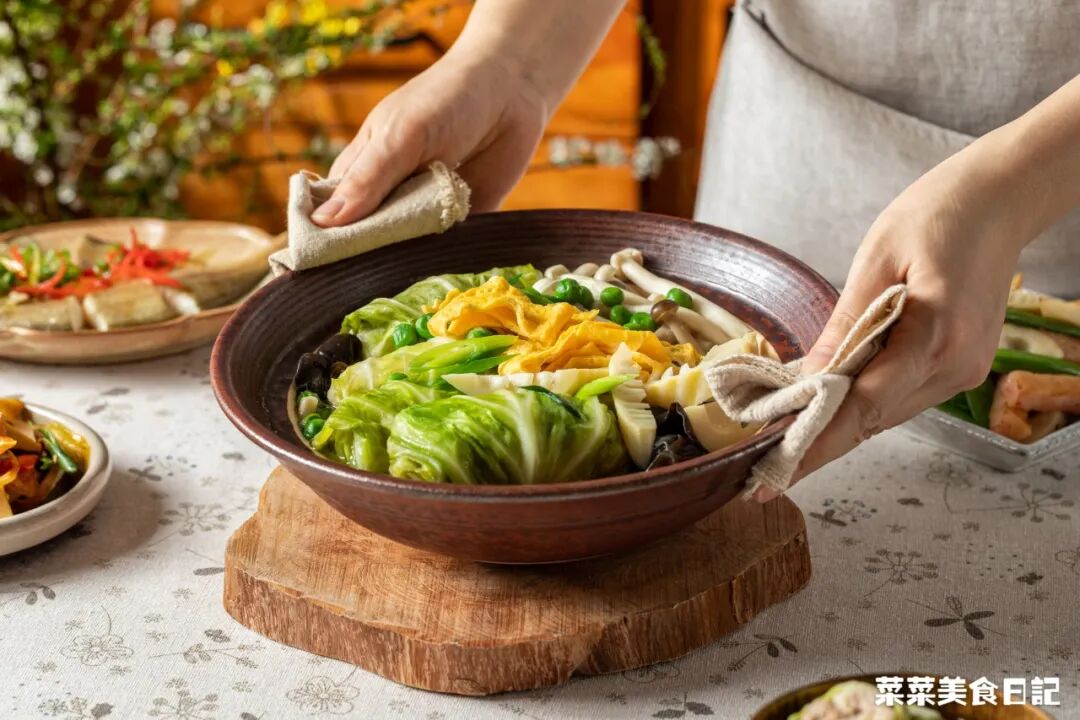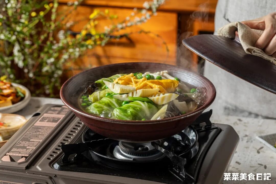 5.砂锅依次放剩余的卷心菜叶子、春笋翡翠卷、春笋、木耳、菌菇、1/2条一汁成鲜高汤、大半碗热水盖盖小火焖煮10分钟