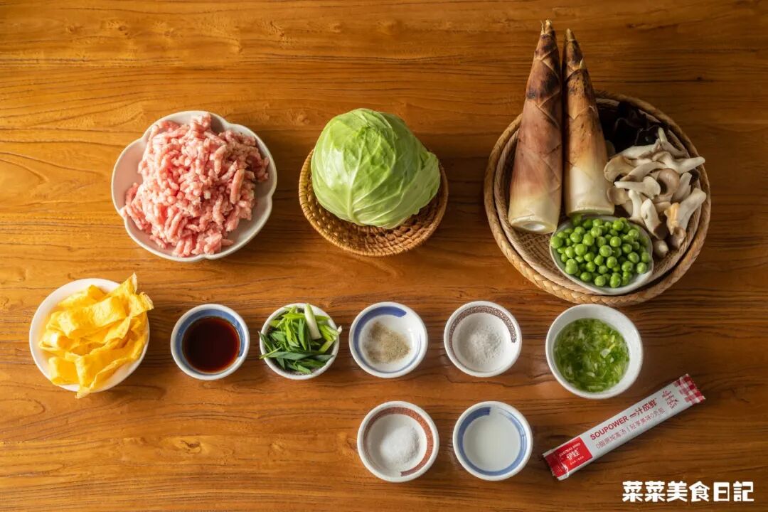 春笋翡翠卷:春笋1颗 卷心菜/包菜/大白菜1颗 猪肉沫(2肥8瘦)300g 葱姜水5大勺 盐1小勺 糖1/8小勺 胡椒粉1/4小勺 生抽1.5大勺 淀粉水1大勺