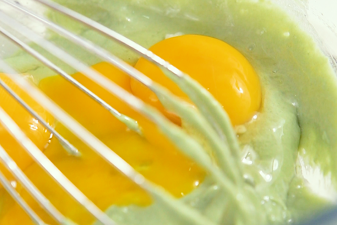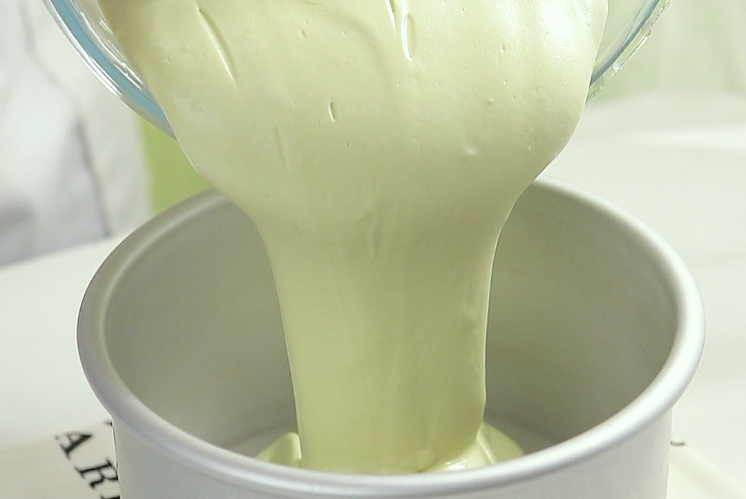 分离蛋清、蛋黄,蛋黄加入抹茶面糊中搅拌均匀