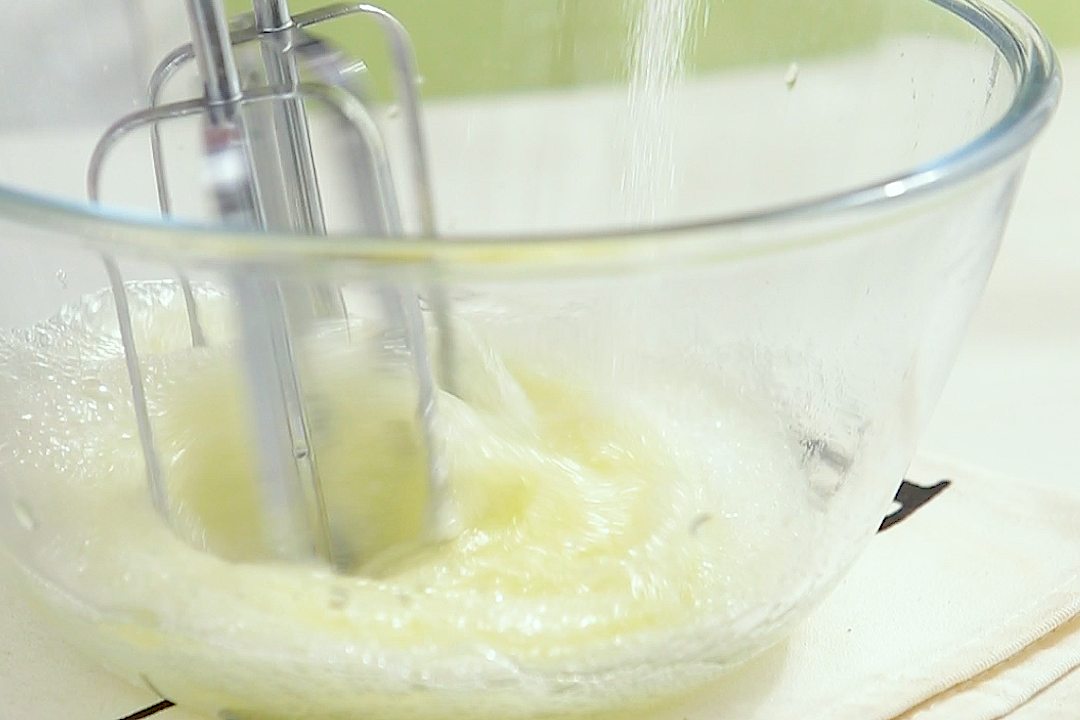 蛋清中加入柠檬汁、1/3白砂糖,用电动打蛋器打至鱼眼发泡