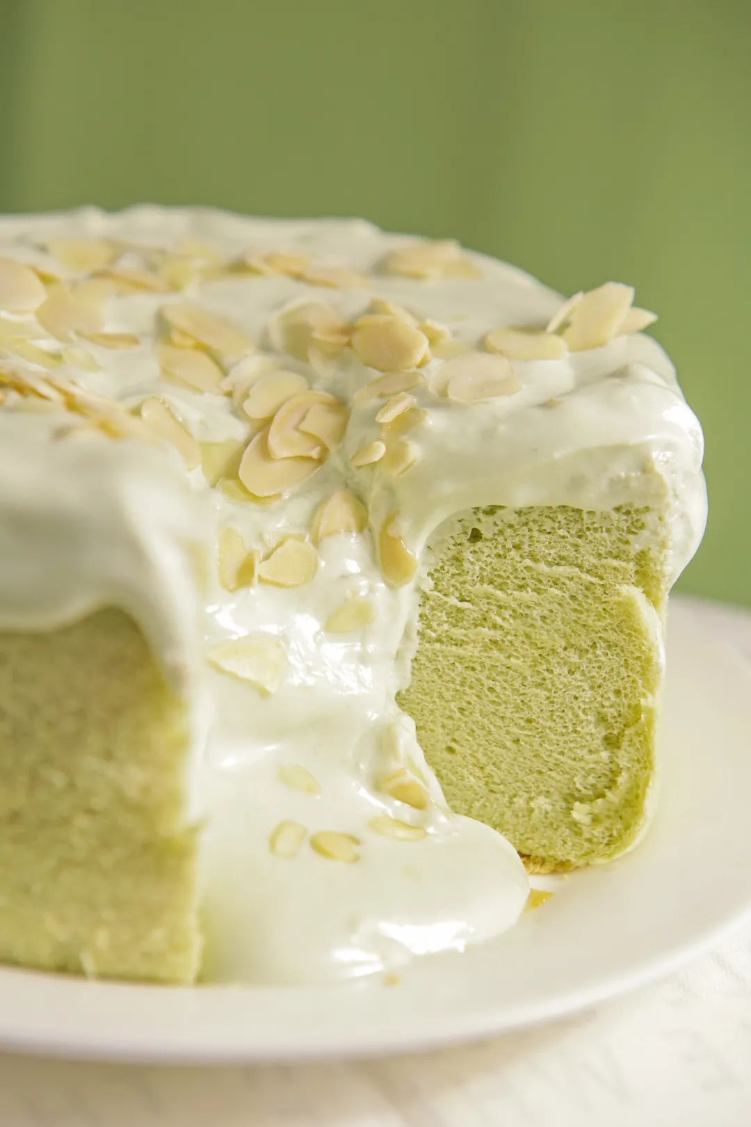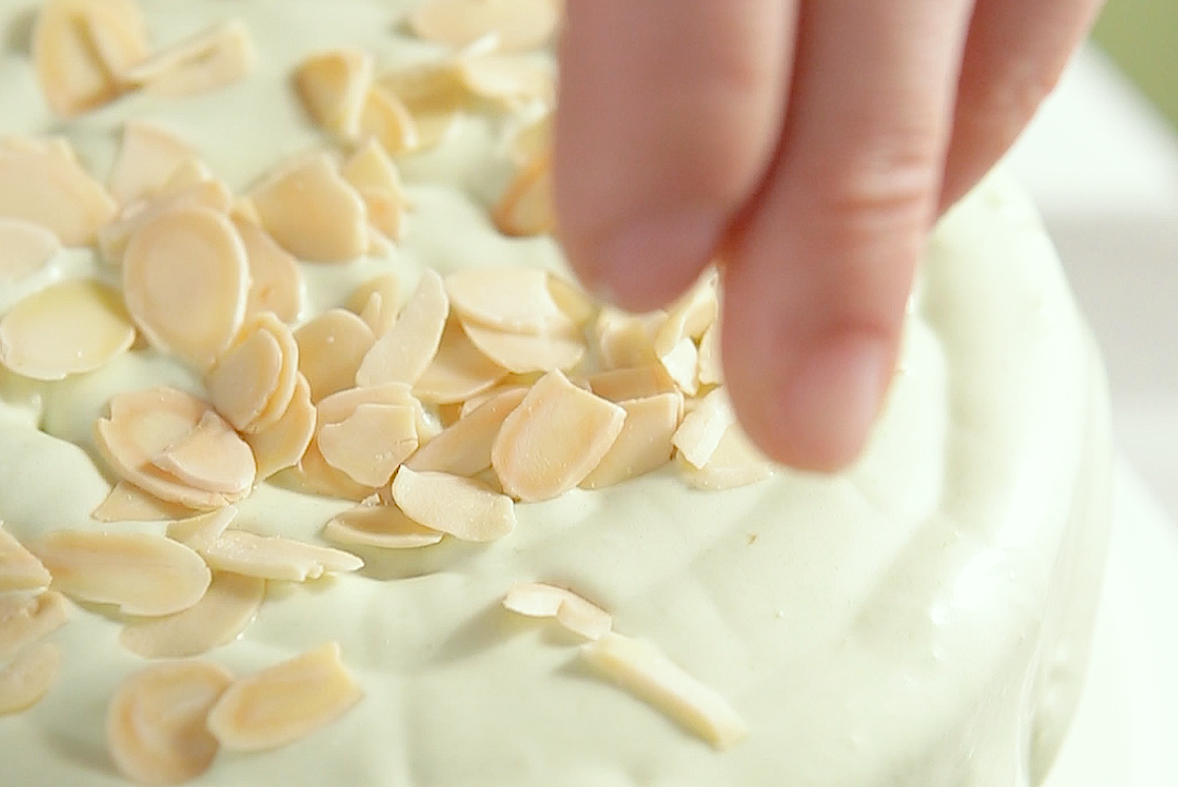 制作奶盖部分,将淡奶油打至5成发,加入酸奶搅拌均匀,加入大麦苗粉搅拌均匀,将制作好的奶盖挤入蛋糕表面,并撒上大杏仁片即可