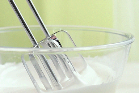 在分次加入剩下的白砂糖打发蛋白至干性发泡,提起打蛋器有小尖角