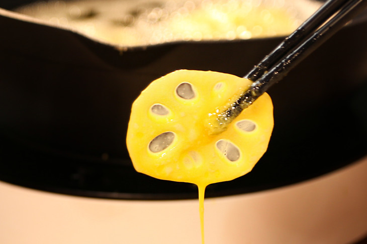3、 平底锅加入适量食用油,小火加热,把藕片蘸上搅拌好的鸡蛋液后下锅煎,三片为一份,每片错开叠加码放,用勺子把剩余鸡蛋液浇在藕片上,煎至底部金黄变色后翻面继续小火煎,煎好装盘晾凉;